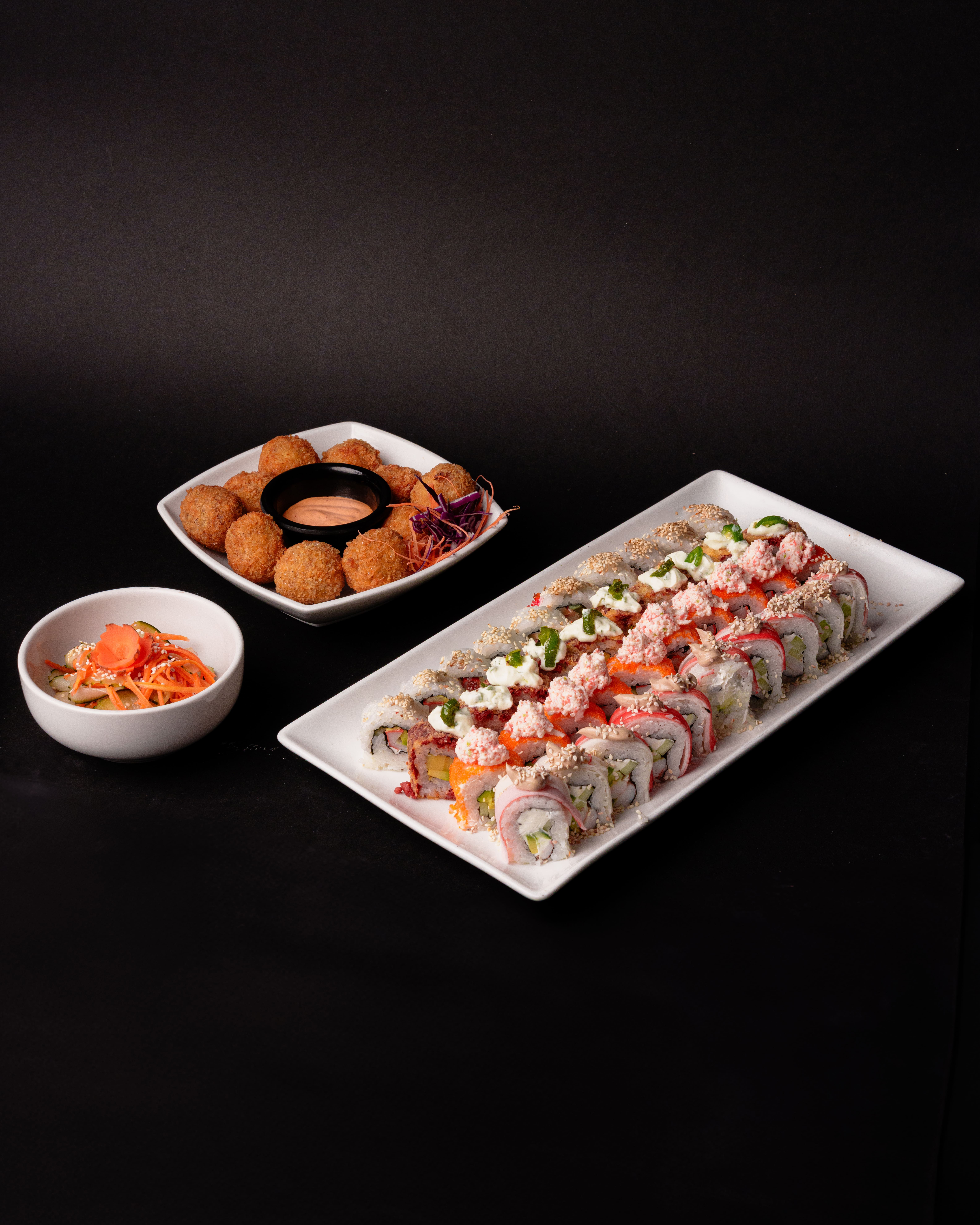 Philadelphia Fried (10 pzas), Banana Maki (10 pzas), Maki Especial (10 pzas), California Black (10 pzas), Avocado Maki (10 pzas), Yakimeshi Bolita (12 pzas), Kushiages de Plátano con Queso (5 pzas), Ensalada de Pepino (1 porción).