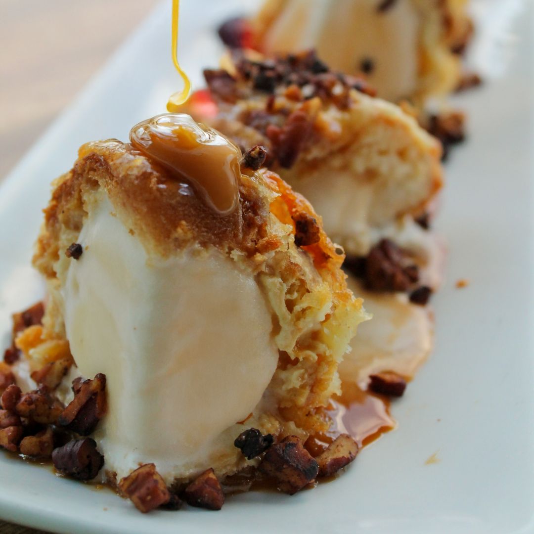 Tradicional chux, relleno con helado de vainilla al tempura y bañado con salsa de fresa, cajeta, chocolate o crema de avellana.