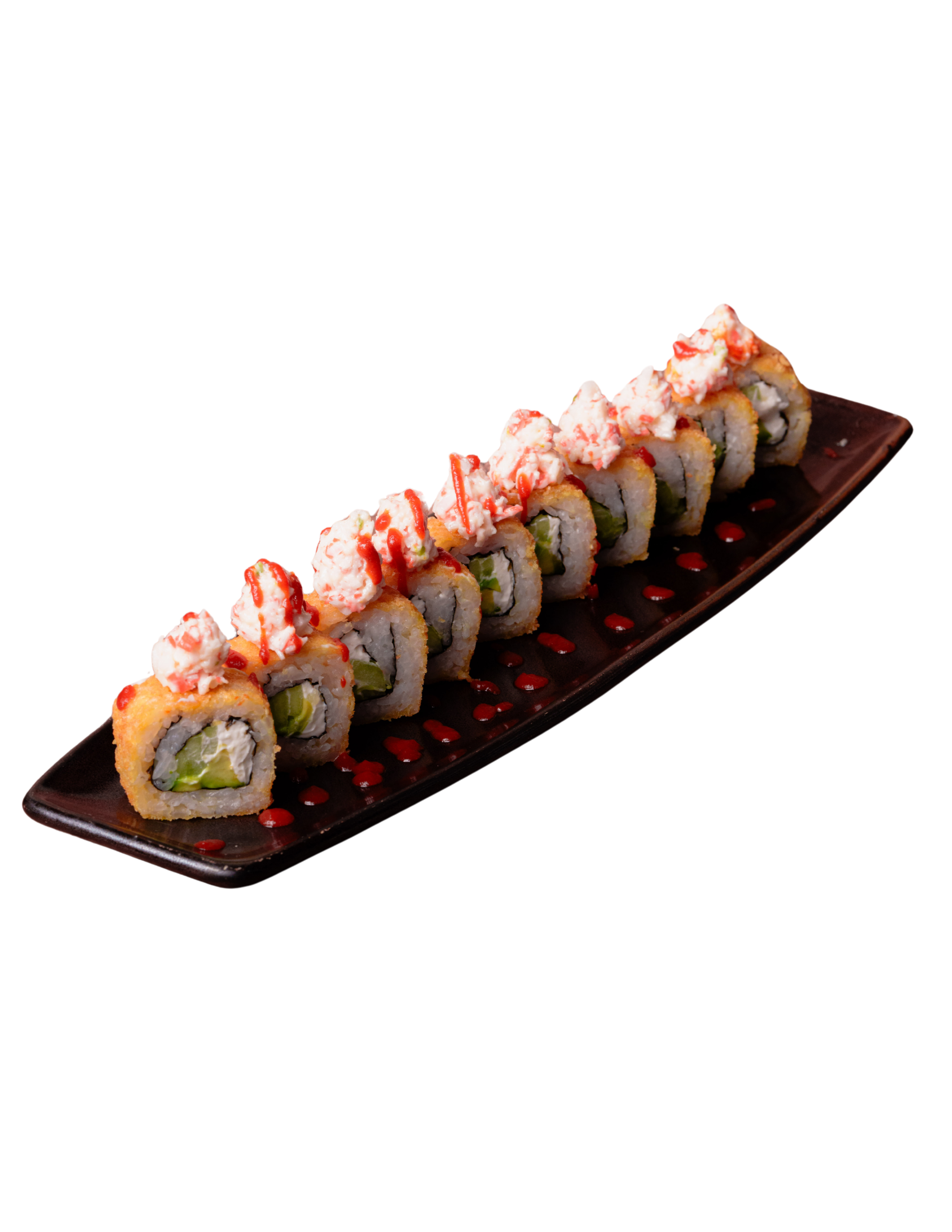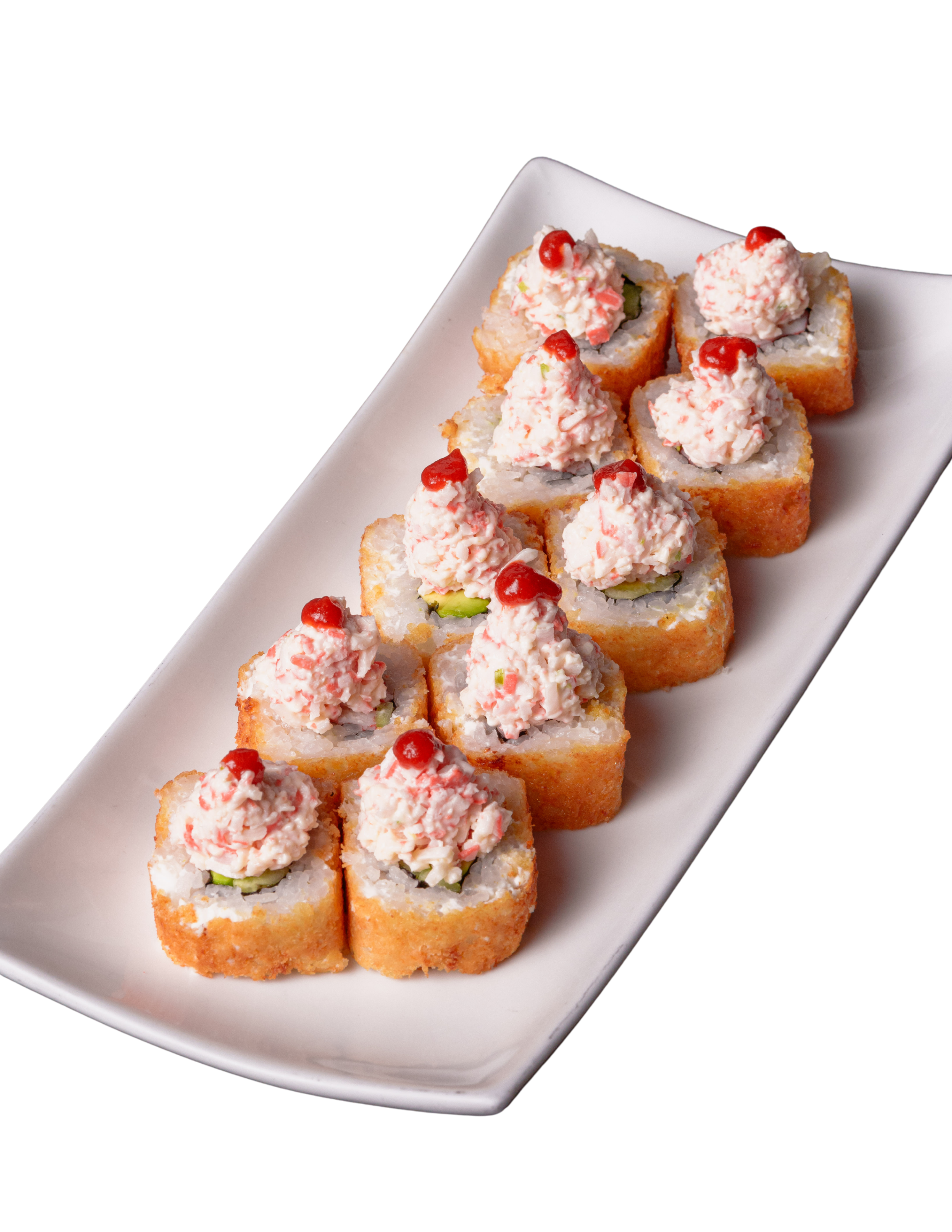 Relleno de aguacate, pepino y surimi (25 g), cubierto con arroz shari, queso crema (40 g) y con crujiente empanizado. Coronado con aderezo tampico (80 g) y salsa sriracha.