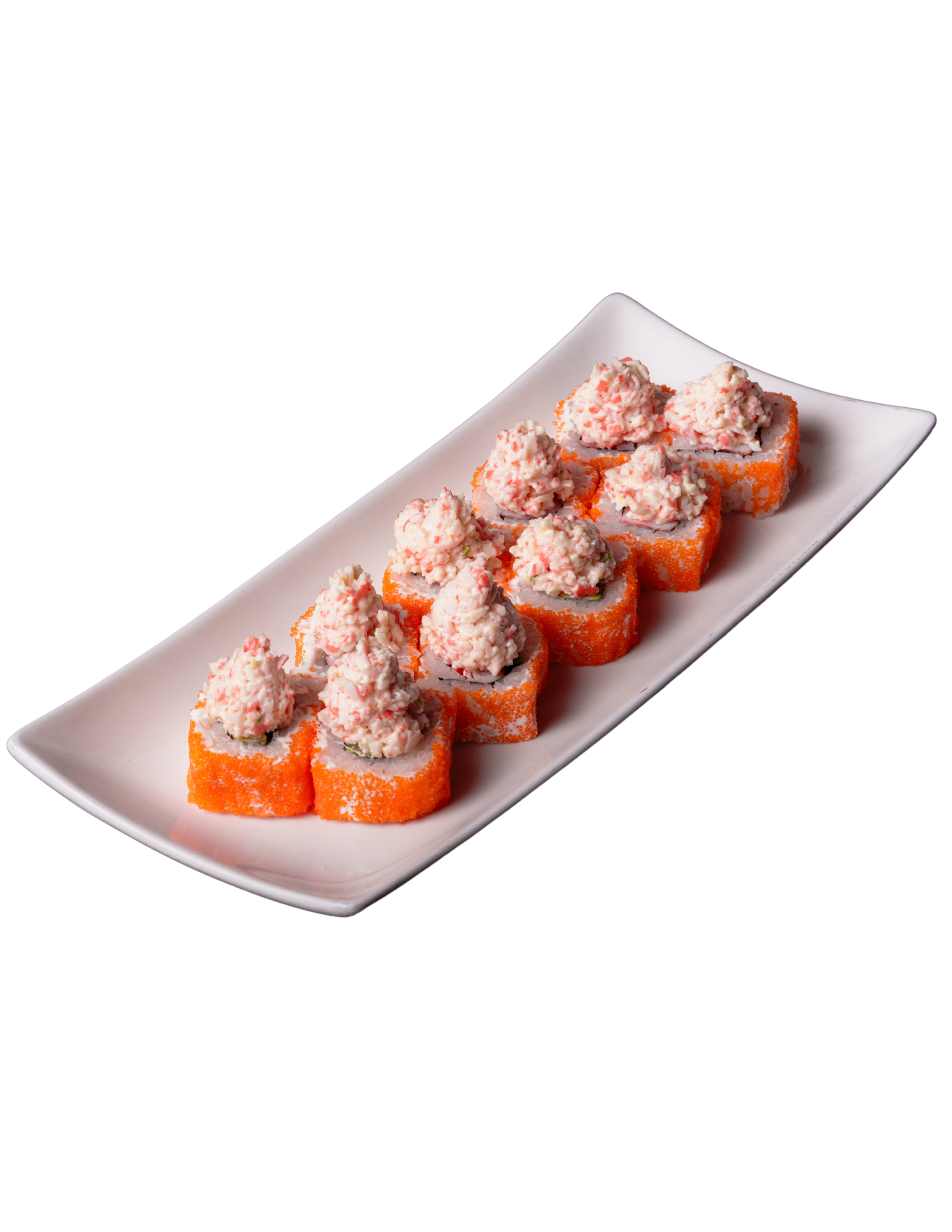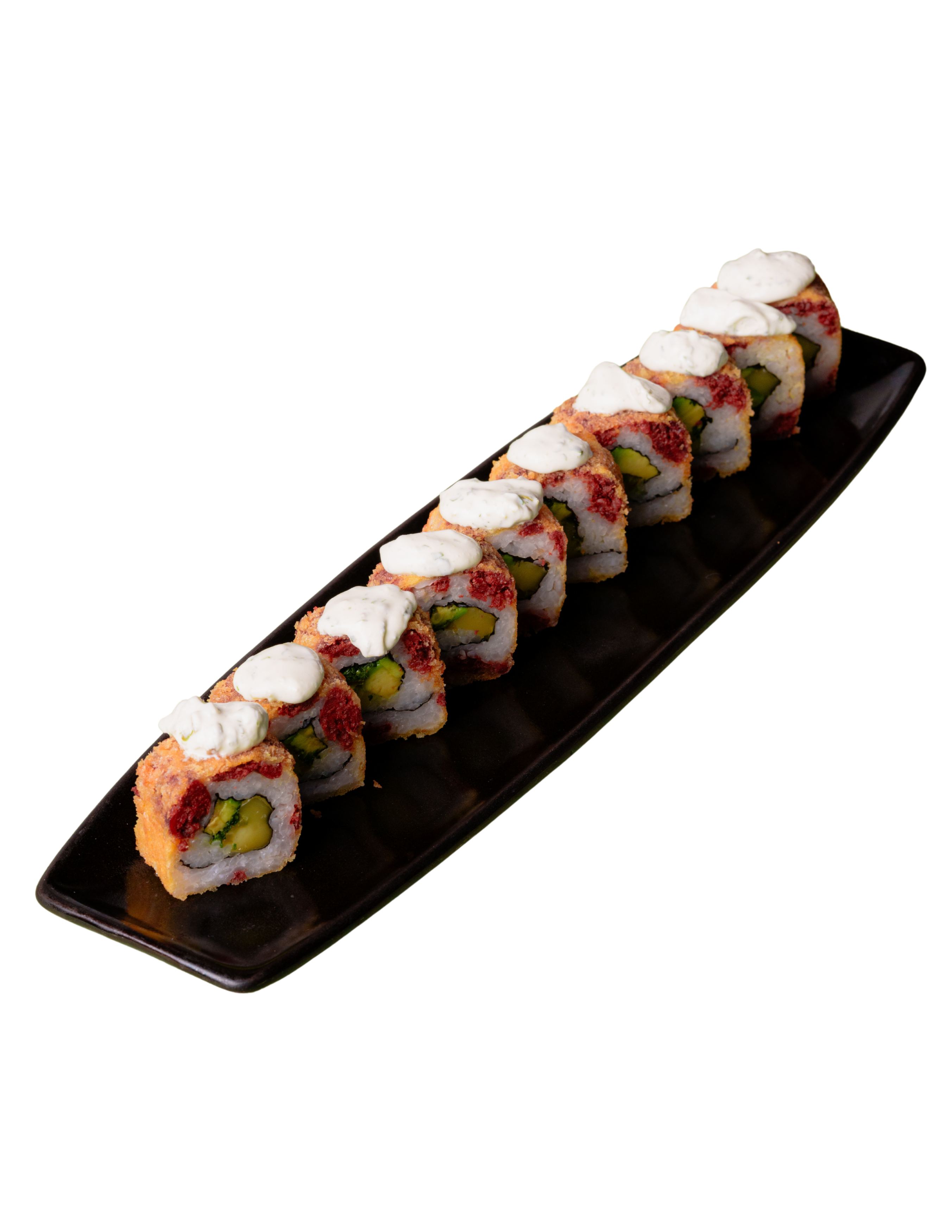 Relleno de aguacate, pepino y surimi (25 g), cubierto con arroz shari, queso crema (40 g) y masago (20 g), coronado con aderezo tampico (80 g).