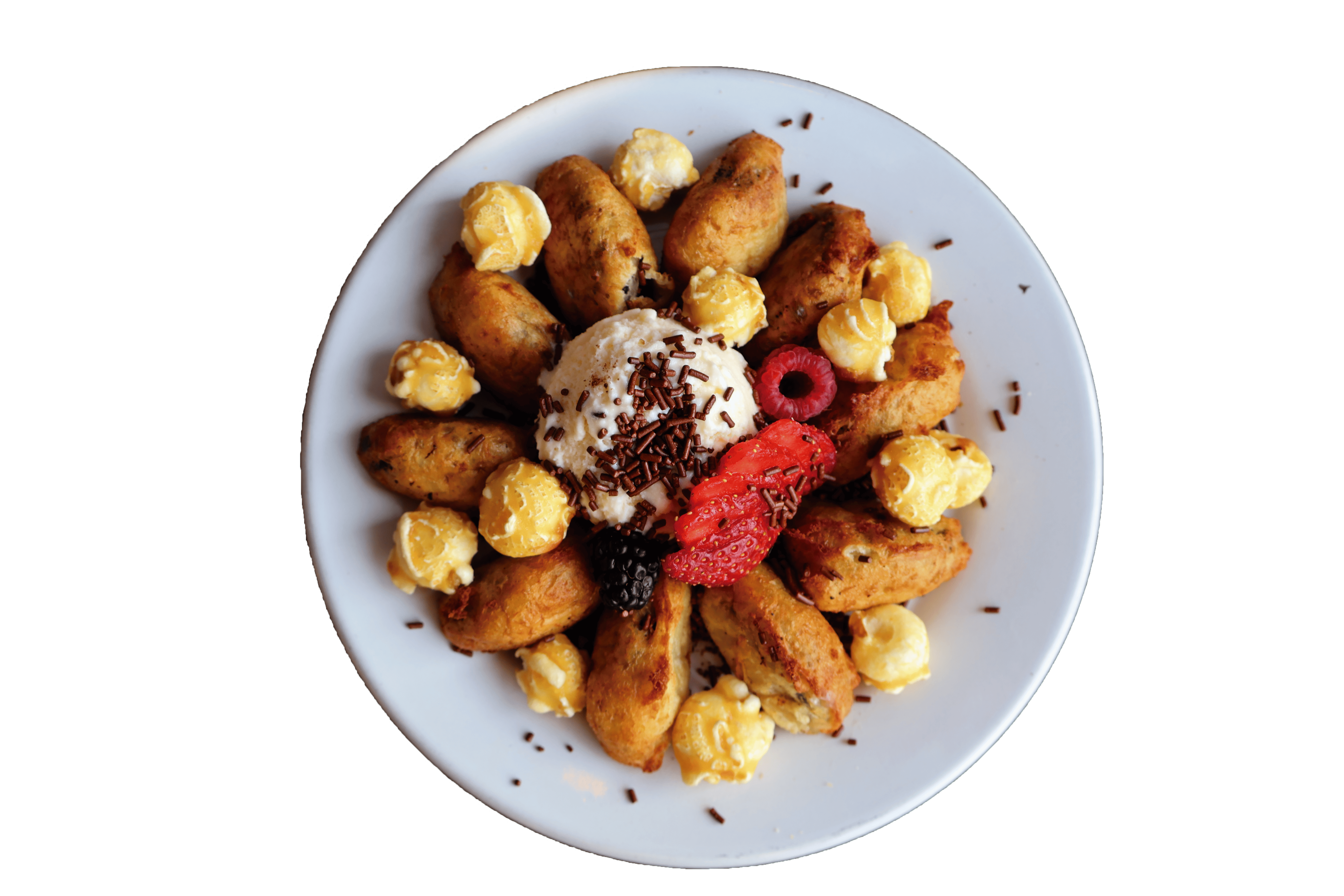 Galleta oreo en pasta dulce tempura, acompañadas de helado de vainilla, palomitas caramelizadas y granillo de chocolate.