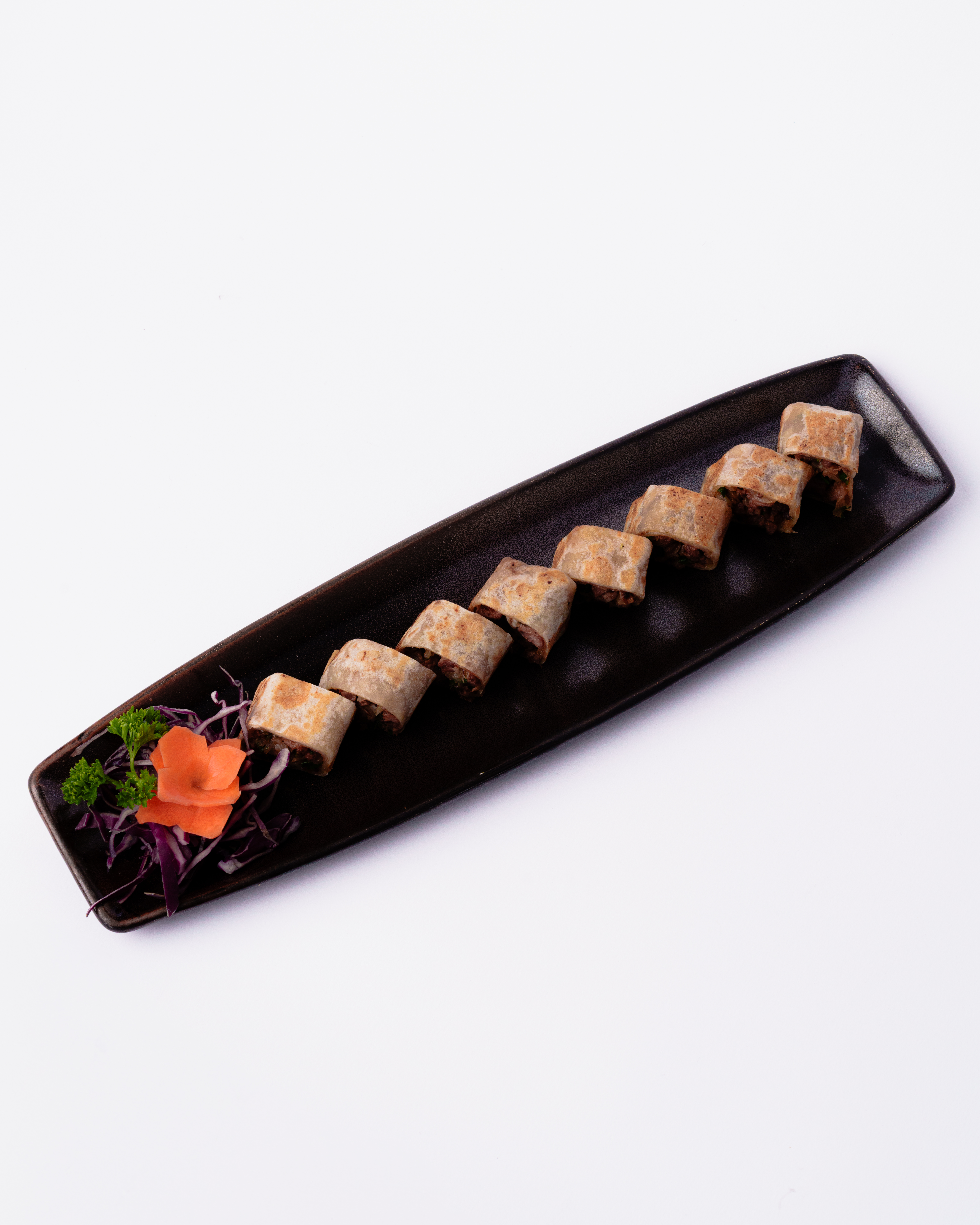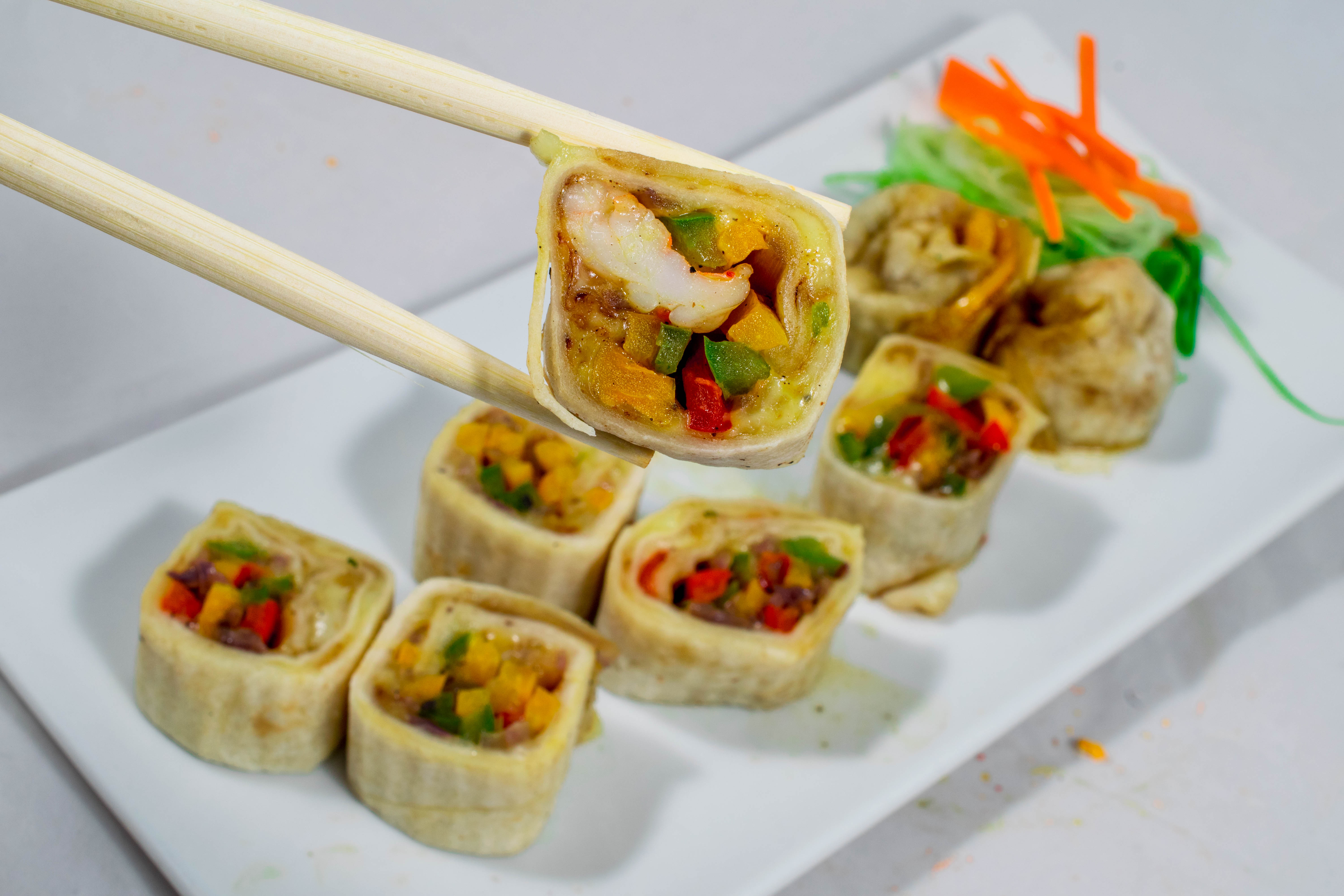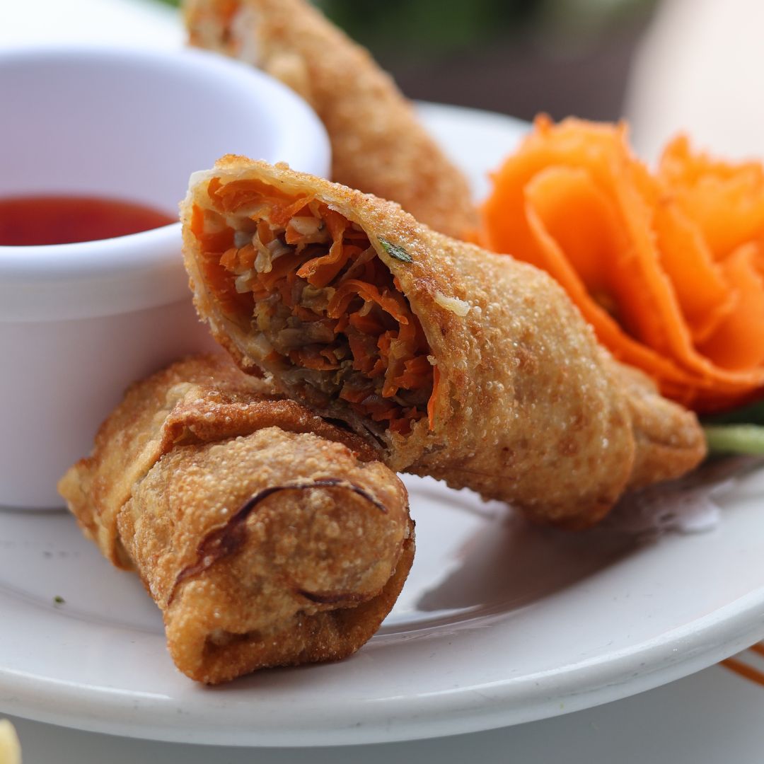 Rollitos crujientes rellenos de col, zanahoria y germen de soya,sazonados con ajo, jengibre y aceite de ajonjolí. Acompañados de salsa de chile dulce.