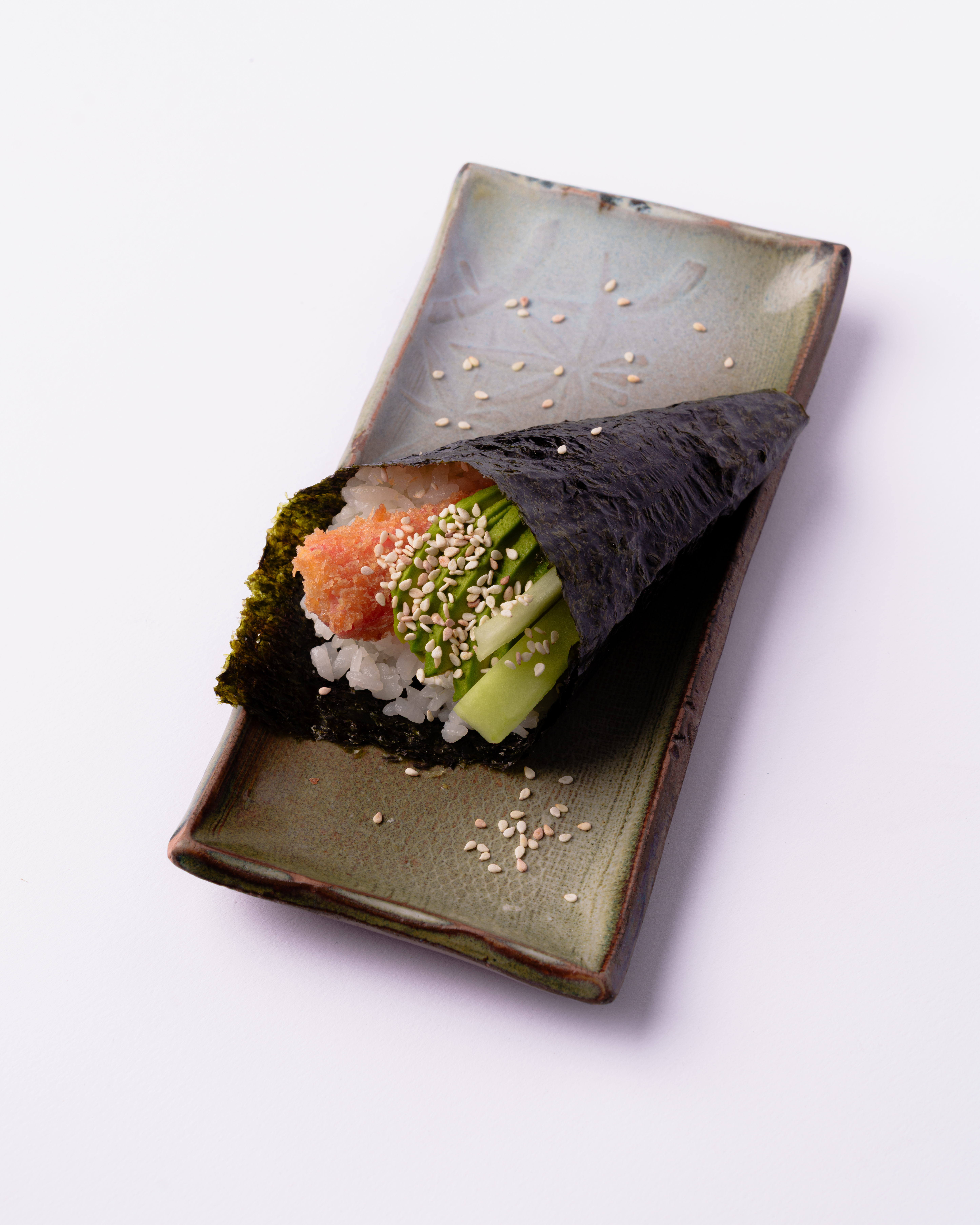 Alga nori rellena de arroz shari, pepino, aguacate y cangrejo empanizado (15 g), bañado con salsa de anguila y ajonjolí blanco tostado.