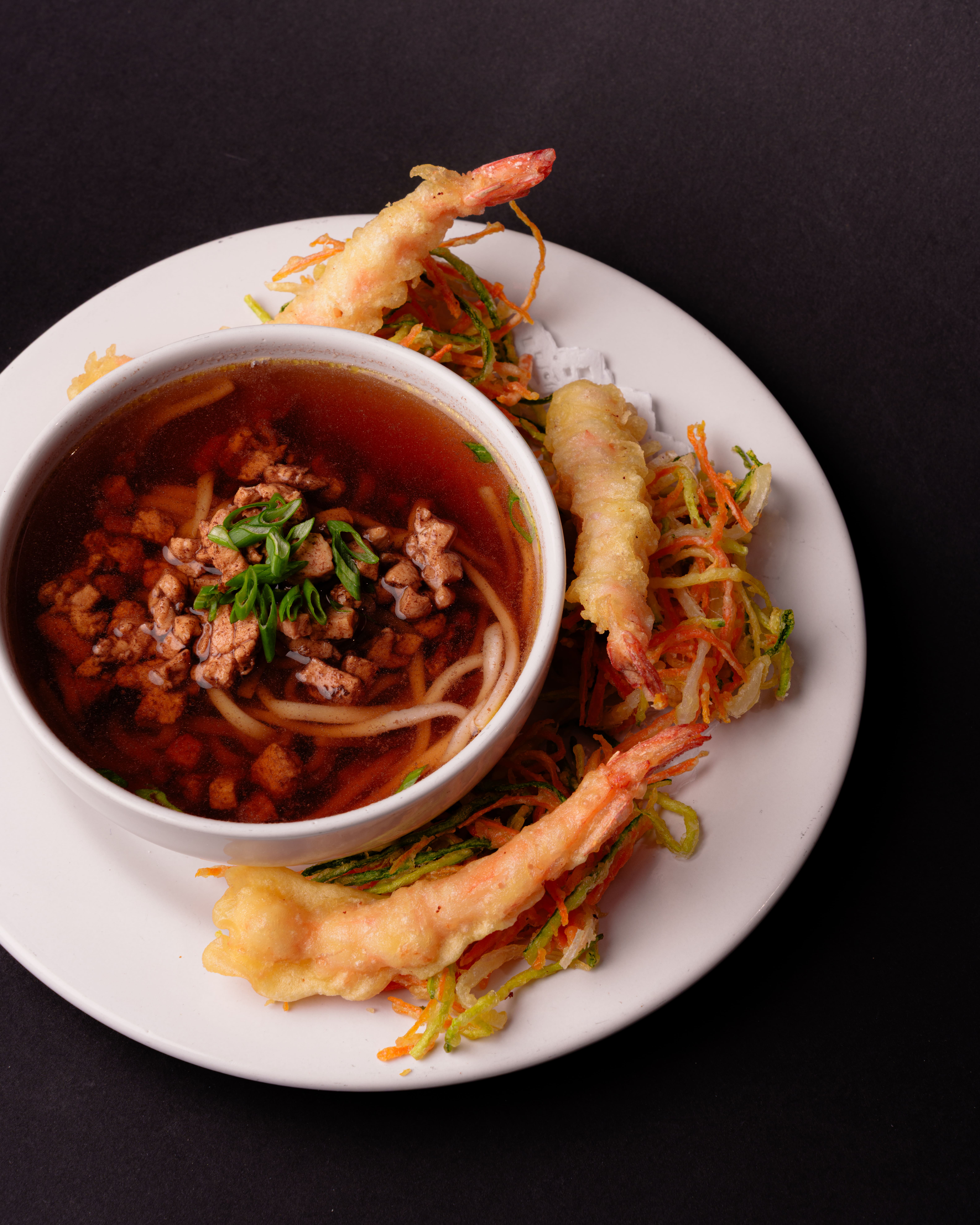 Fondo de pollo (60 g) y soya, con camarón tempureado (45 g), verduras tempureadas y fideos udon.
