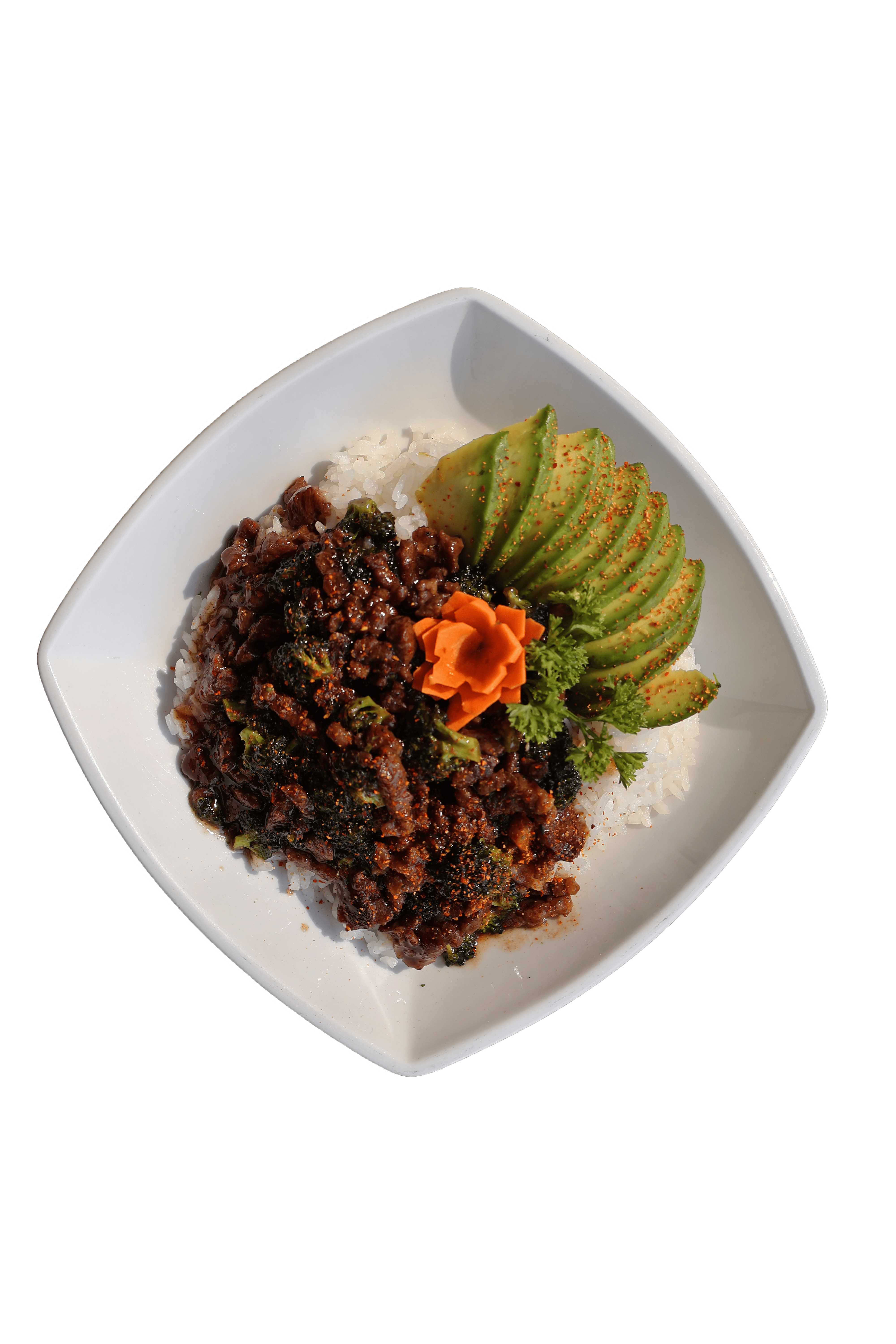 Arroz gohan con arrachera a la plancha (100 g), bañado con salsa teriyakiy sriracha, acompañado de brócoli, aguacate y shichimi togarashi (chilejaponés).