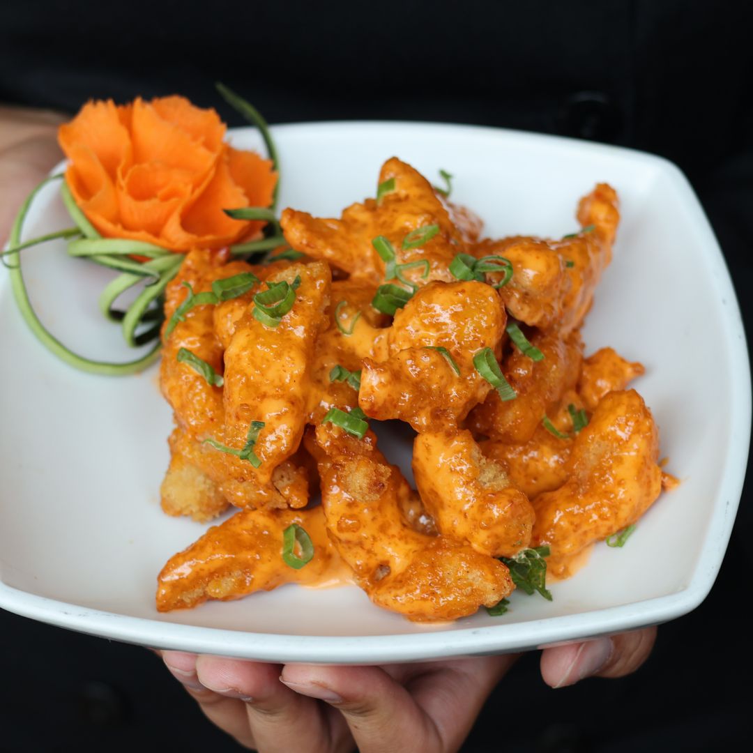 Camarones (120 g) crocantes, bañados en aderezo roca(dulce y picante) y cebollín espolvoreado.