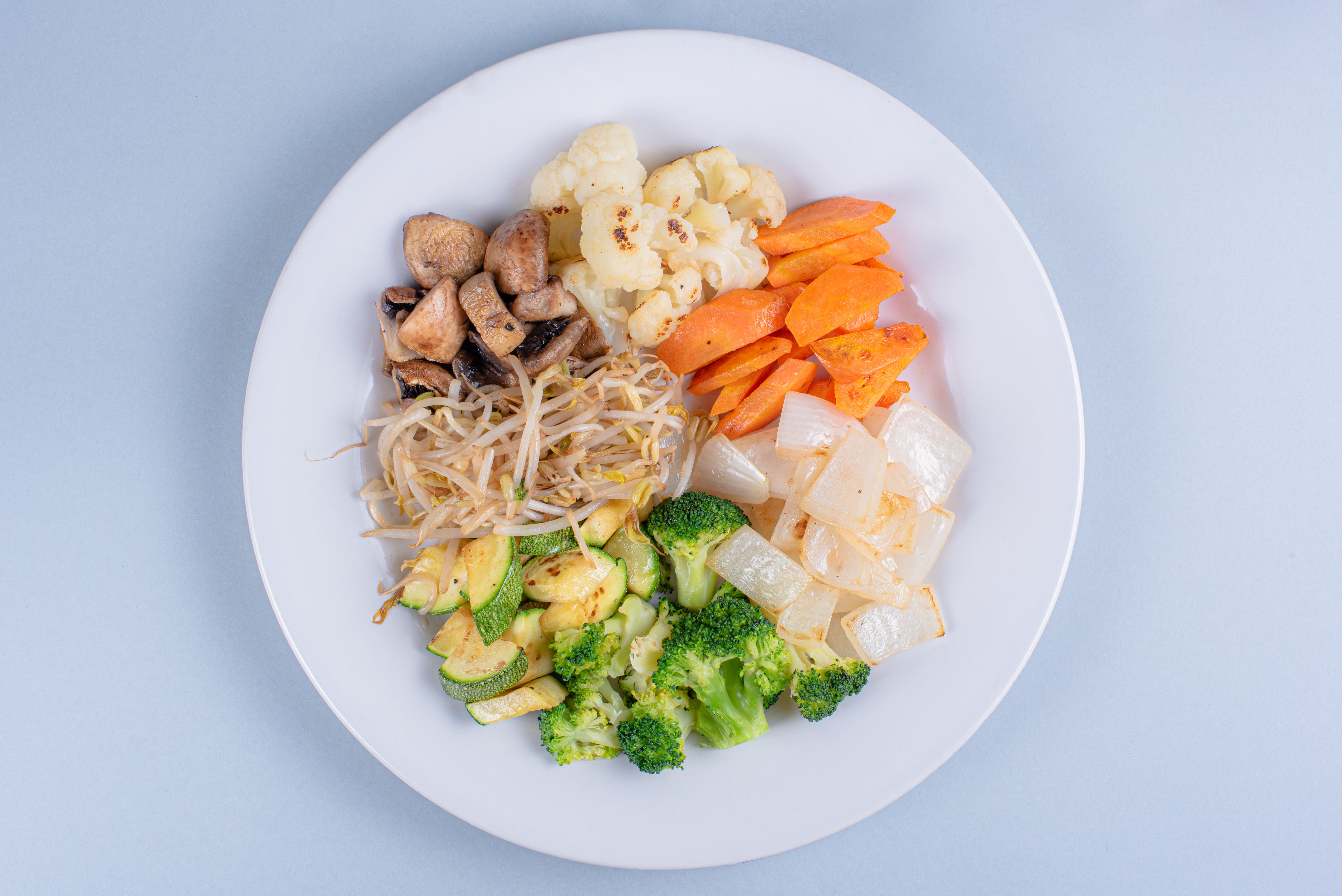 Combinación de vegetales frescos a la plancha; germen de soya, calabaza, zanahoria, champiñón, cebolla, brócoli y coliflor, sazonados con salsa de soya.