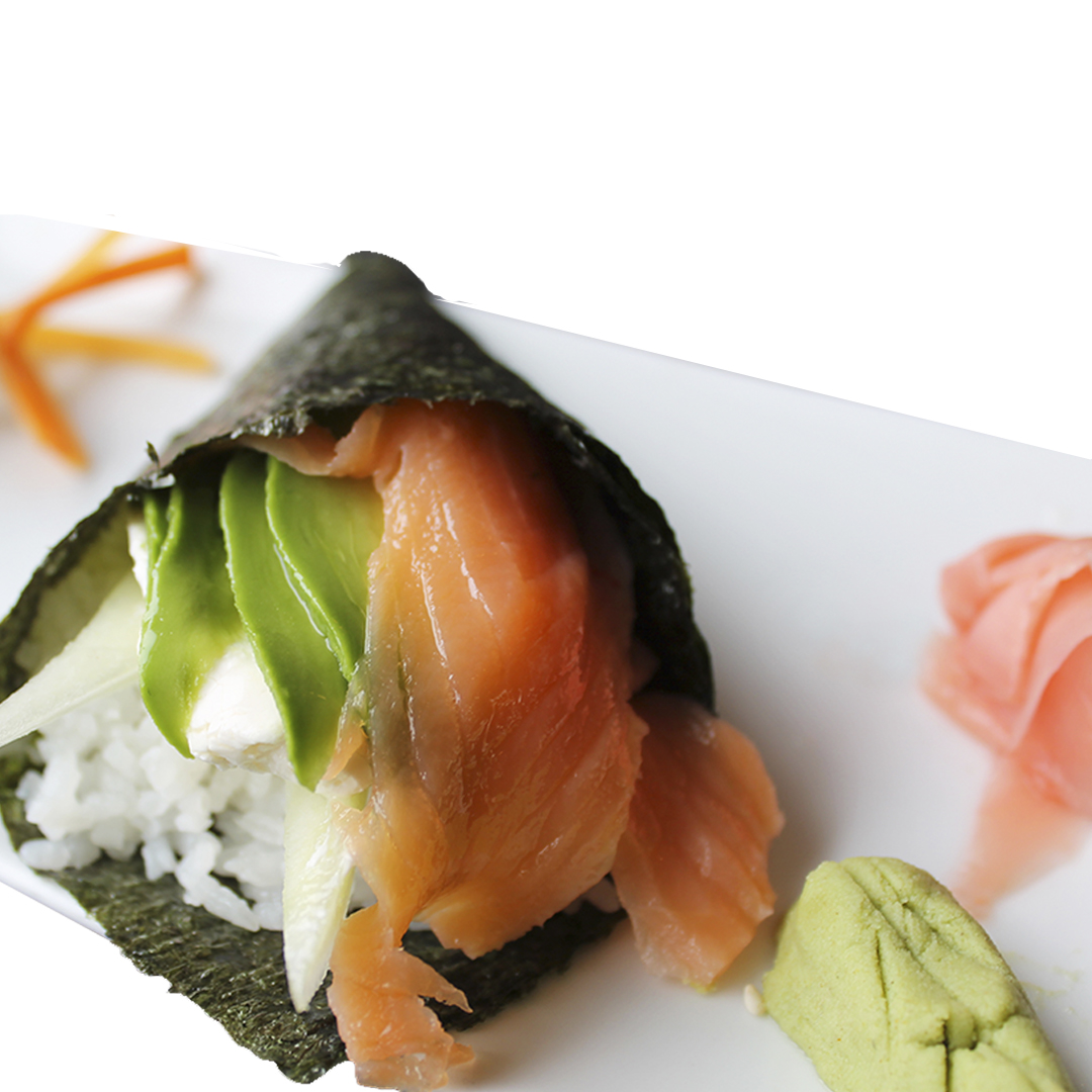 Alga nori rellena de arroz, queso crema (10 g), pepino, aguacate, salmón fresco (20 g).