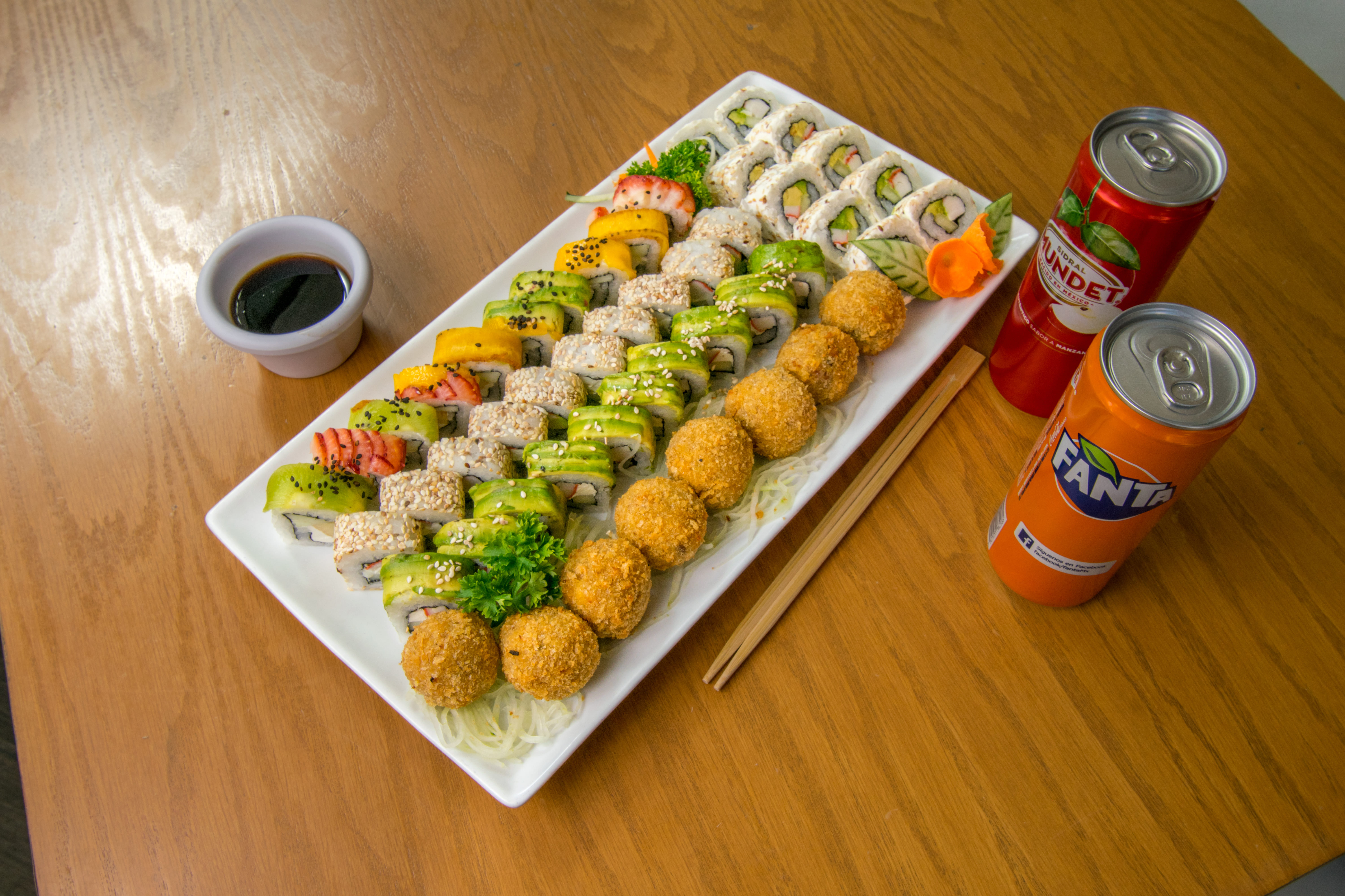 California Maki (10 pzas), Avocado Maki (10 pzas), Philadelphia Maki (10 pzas), Frutaki Maki (10 pzas), Yakimeshi Bolita (8 pzas), Ensalada de Pepino (1/2 porción).