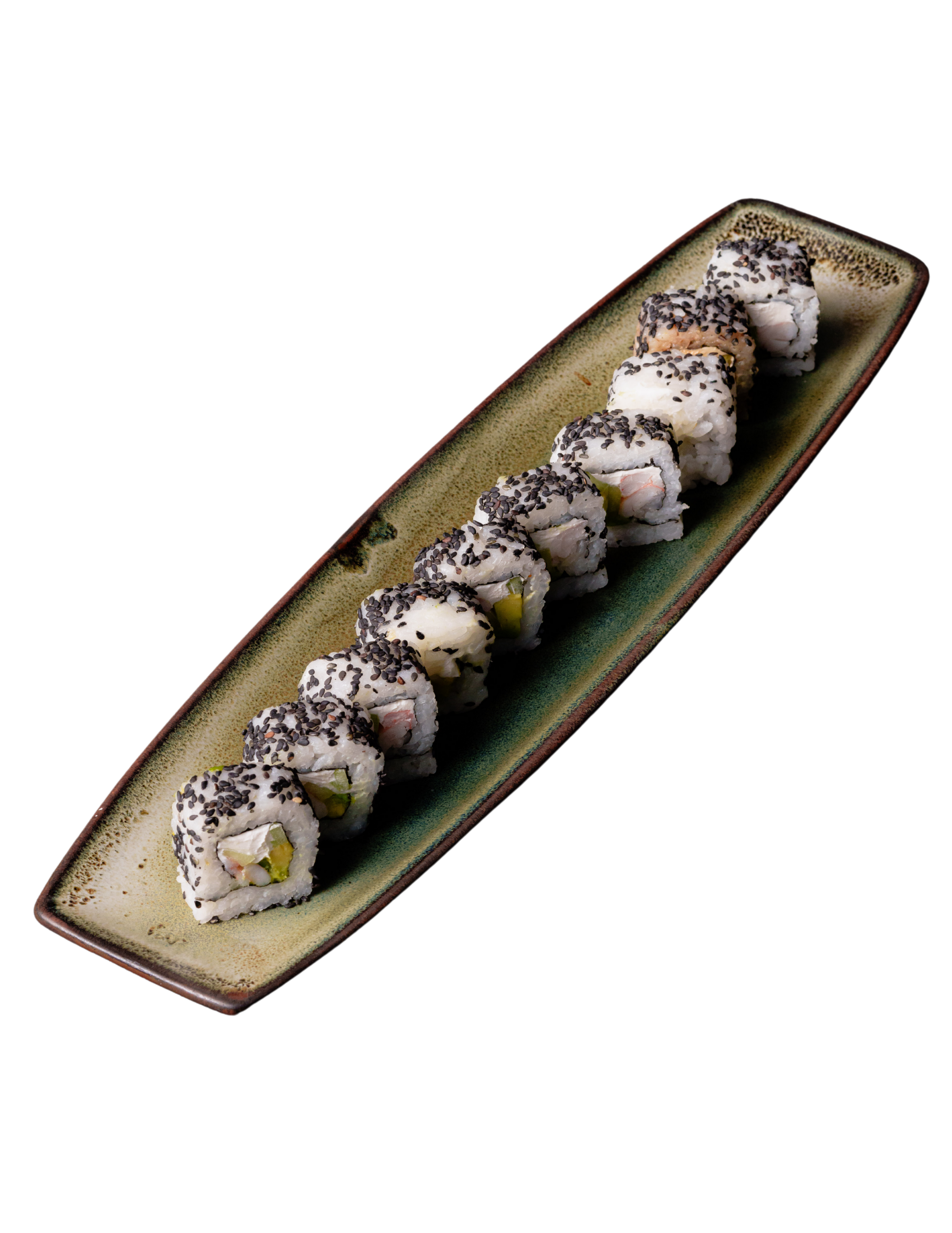 Relleno de queso crema (20 g), pepino, aguacate y camarón marinado(15 g), cubierto con arroz shari y ajonjolí negro tostado.