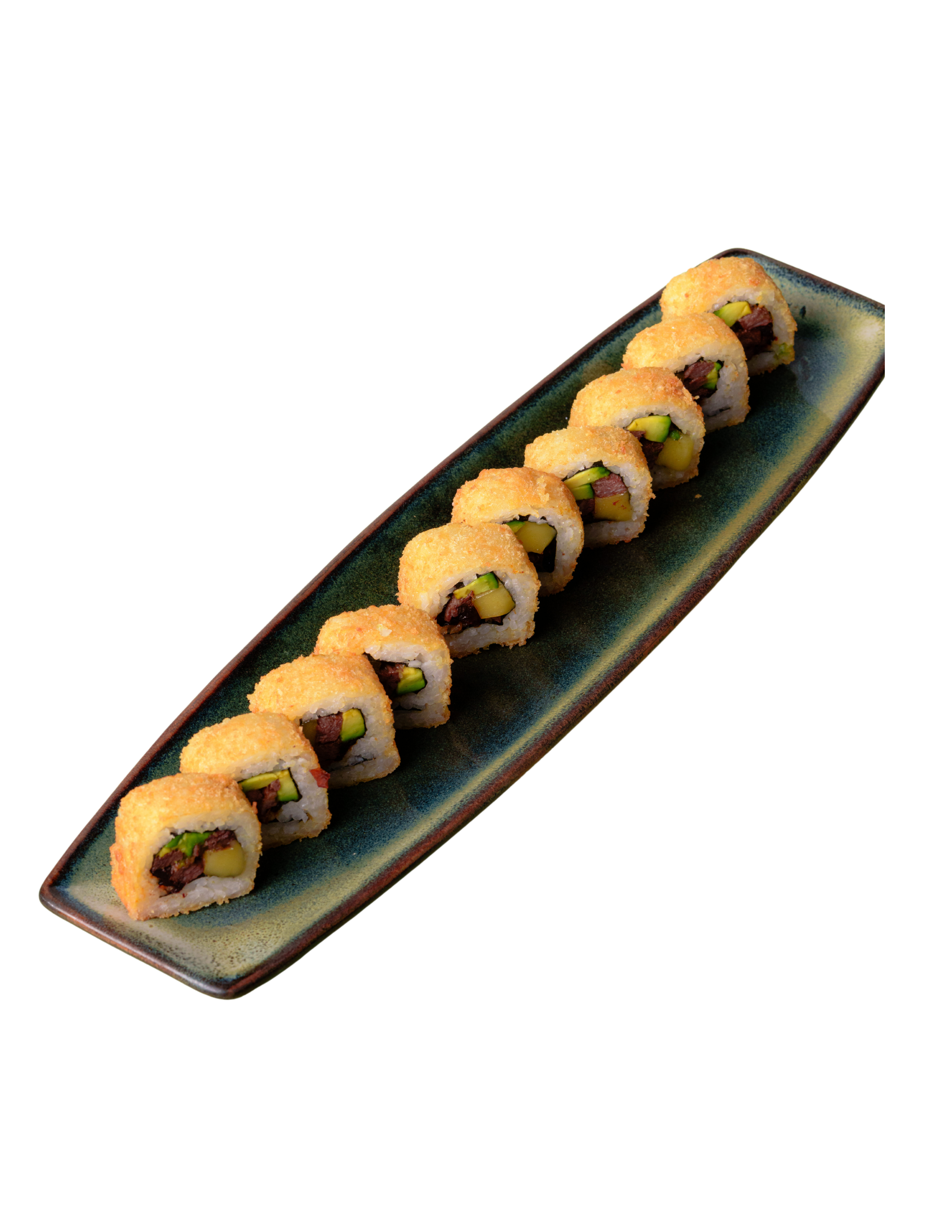 Relleno de queso crema (20 g) , aguacate, pepino y filete de res (20g), cubierto con arroz shari y crujiente empanizado.
