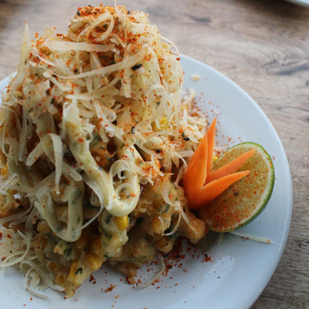 Granos de elote tempureados con mayonesa de epazote,queso parmesano (20 g) y chile japonés en polvo.