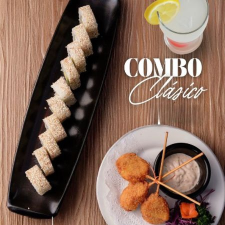 Un combo para disfrutar. Incluye: un California Maki (10 pzas), 3 kushiagues de plátano y una bebida a elegir.