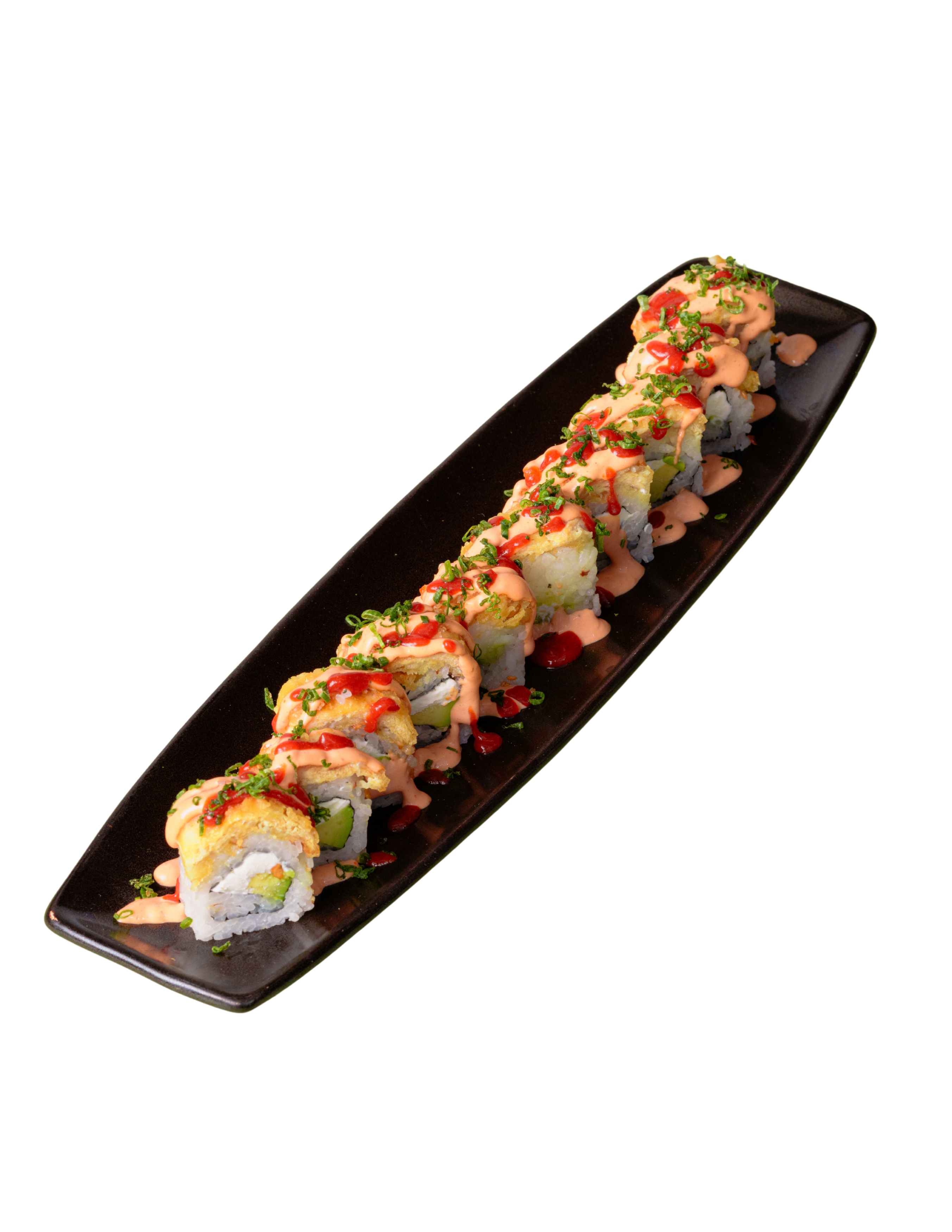Relleno de queso crema (20 g) y aguacate, cubierto con arroz shari, hojuelas de ajo doradas trituradas y pechuga de pollo al tempura (50 g), bañado con aderezo de chipotle, salsa shiracha y cebollín fresco.