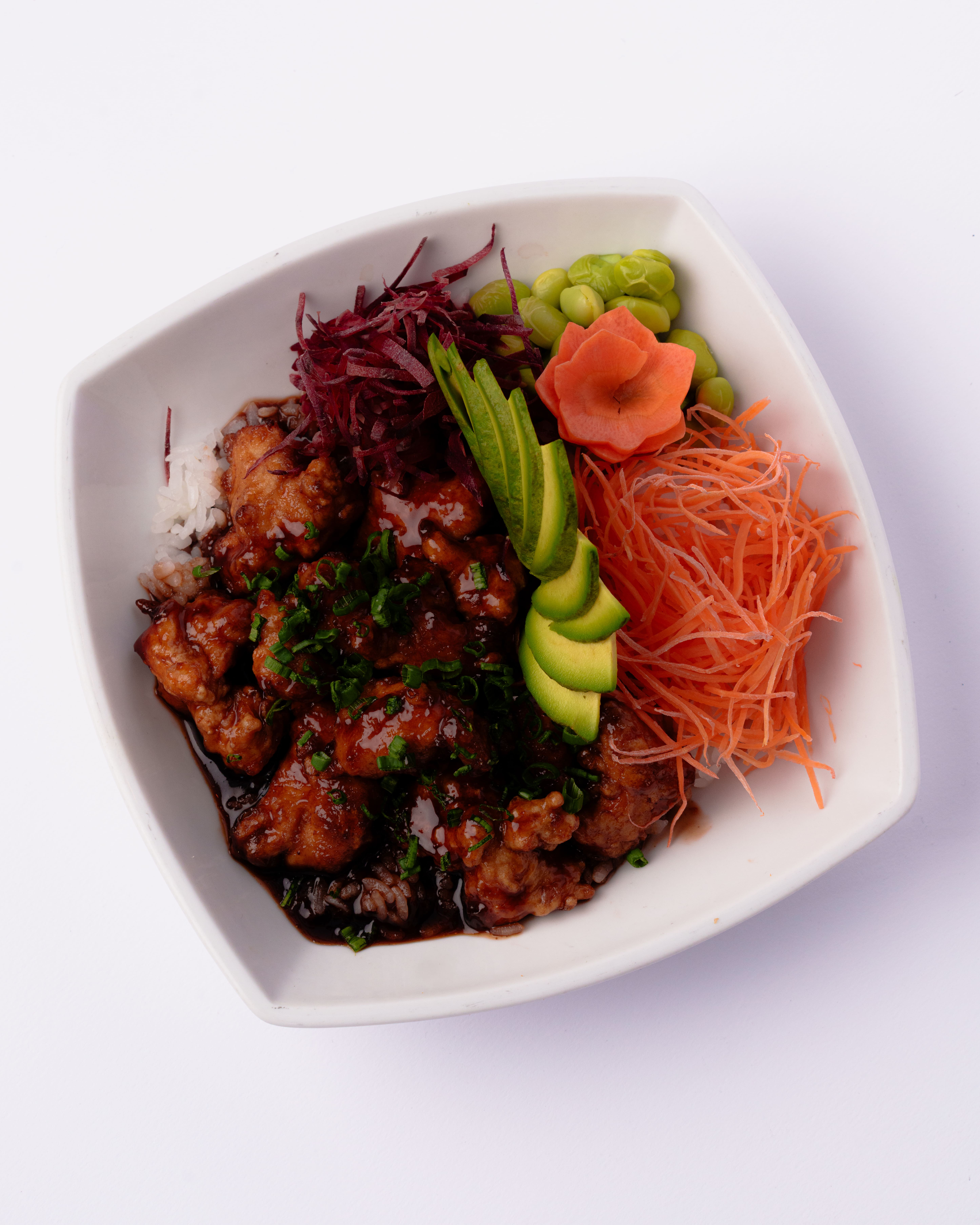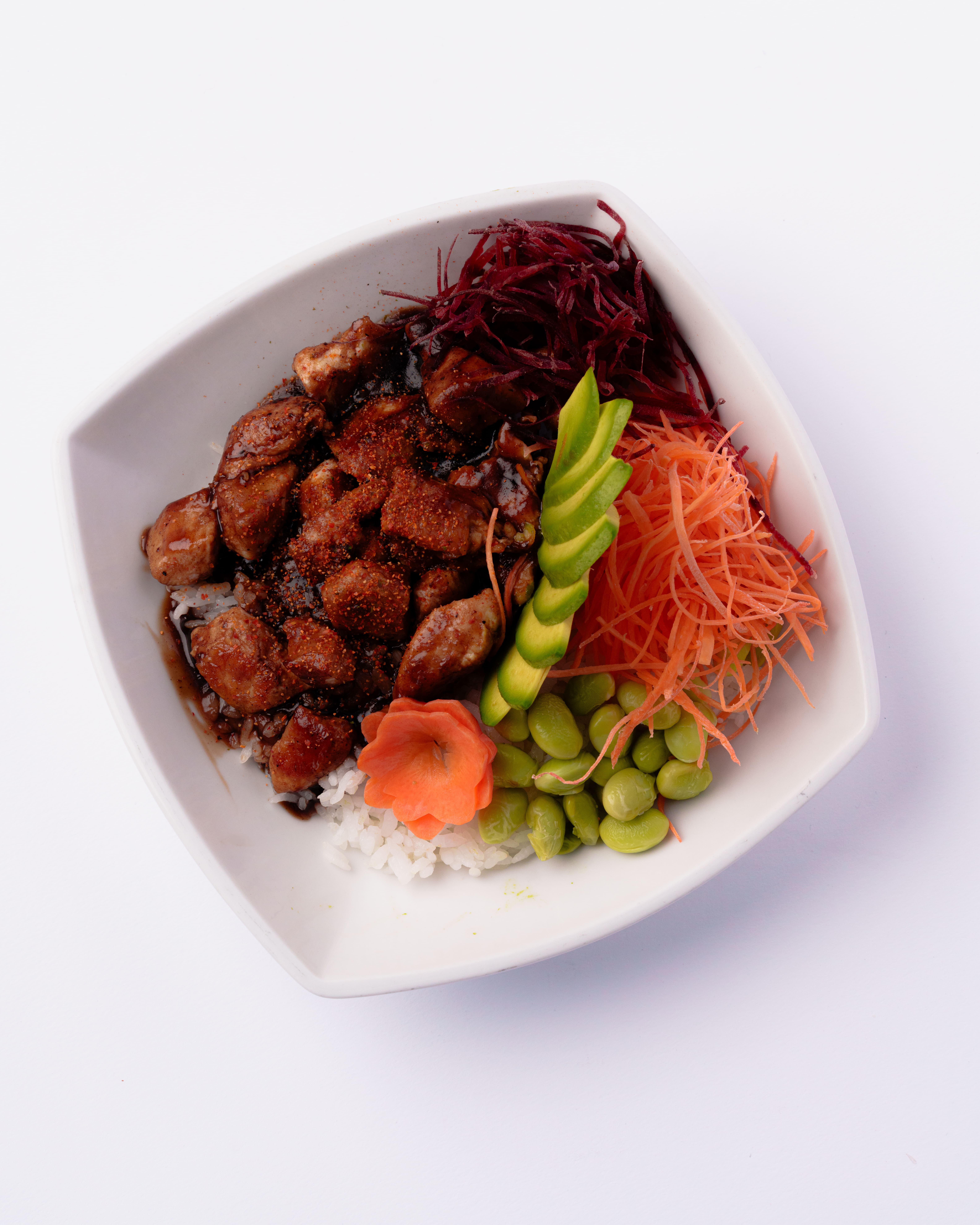 Arroz gohan con pollo a la plancha (150 g), bañado con salsa teriyaki, espolvoreado con shichimi togarashi (chile japonés), acompañado con betabel, zanahoria, edamames y un abanico de aguacate.