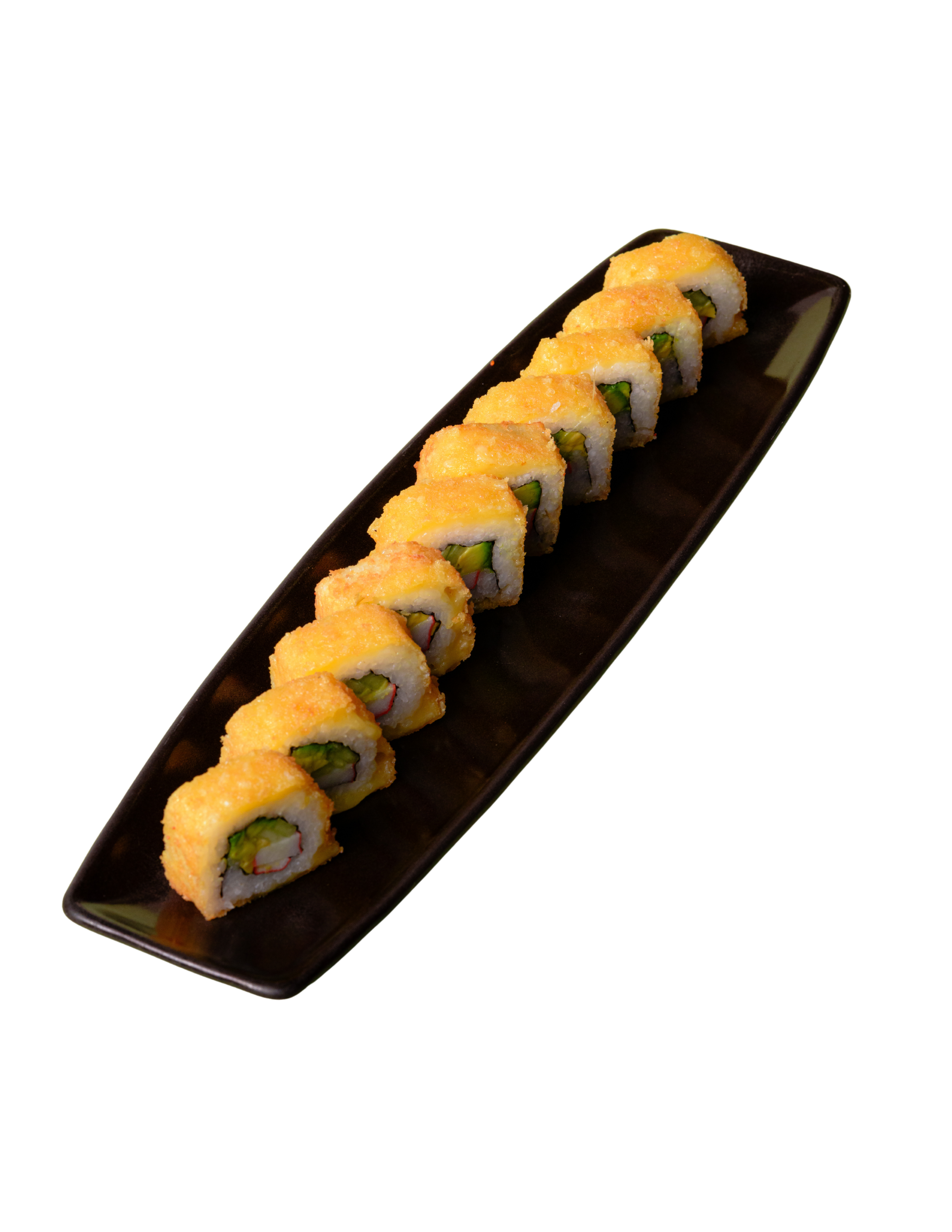 Relleno con surimi (25 g), aguacate y pepino, cubierto con arroz shari y queso gouda (50 g), con crujiente empanizado.
