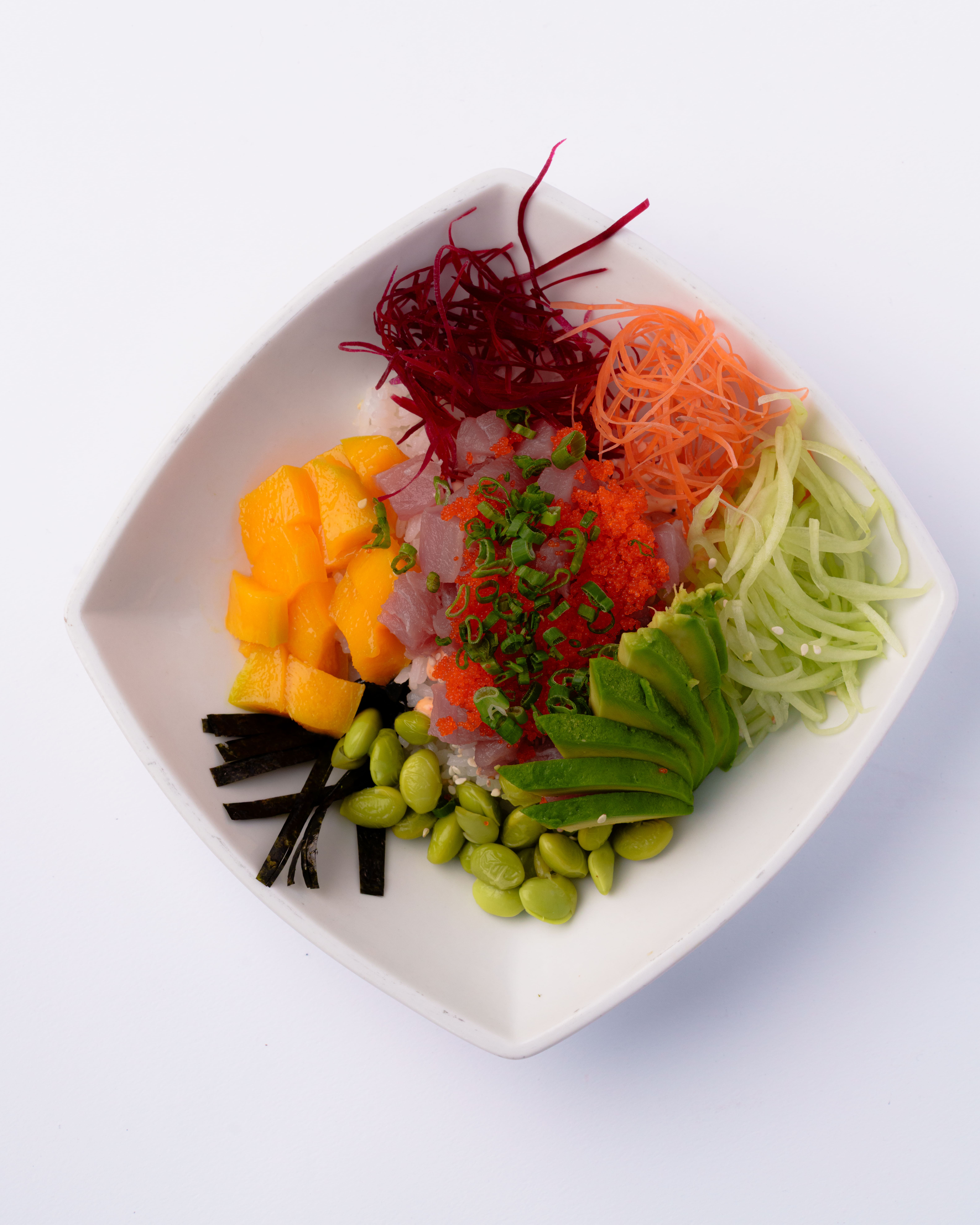 Arroz shari con furikake, acompañado de atún fresco (70 g), pepino, mango, betabel, zanahoria, edamames y un abanico de aguacate, terminado con aderezo spicy.