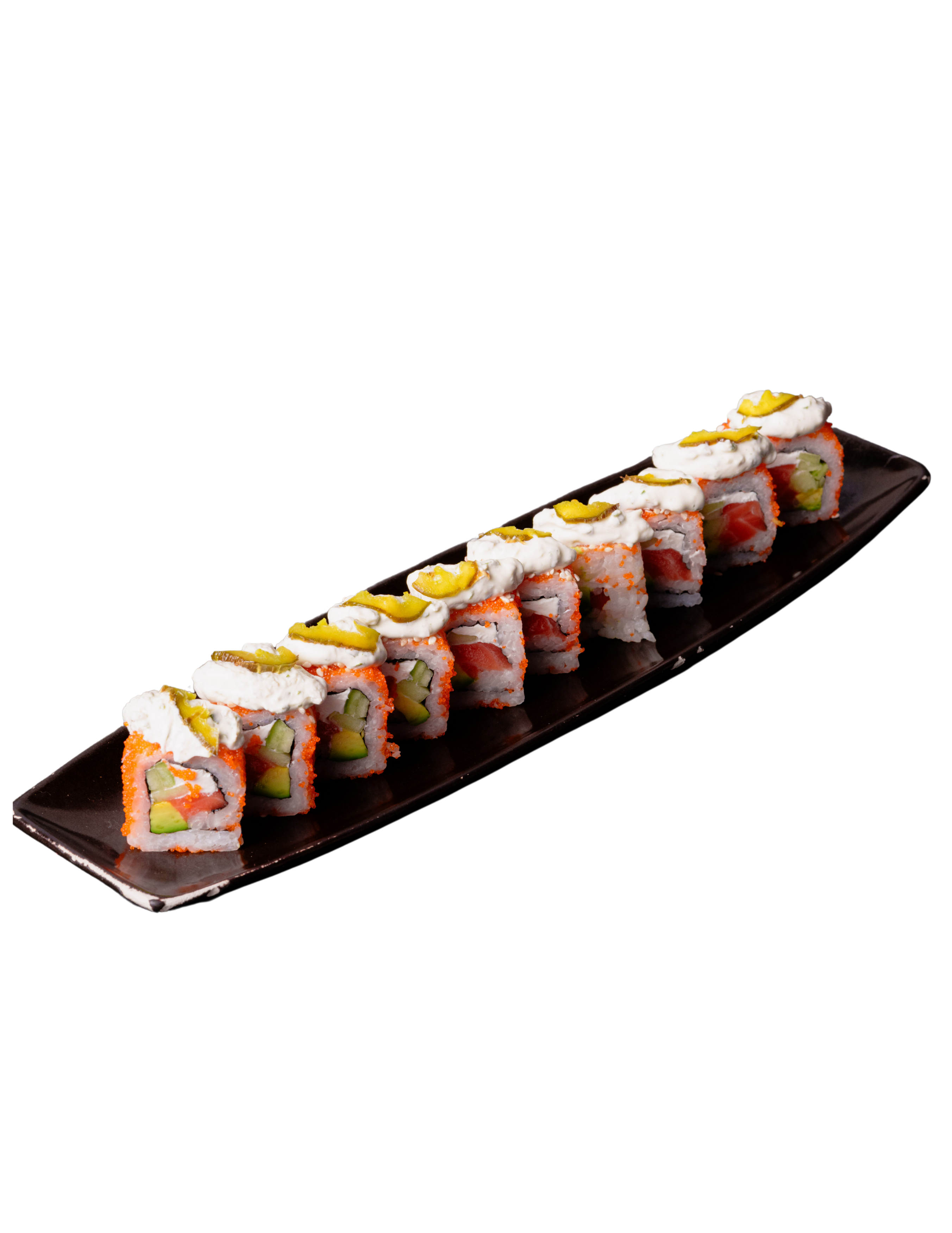 Relleno de salmón fresco (20 g), queso crema (20 g), aguacate y pepino, cubierto con arroz shari y masago (20 g) y coronado con aderezo jalapeño.
