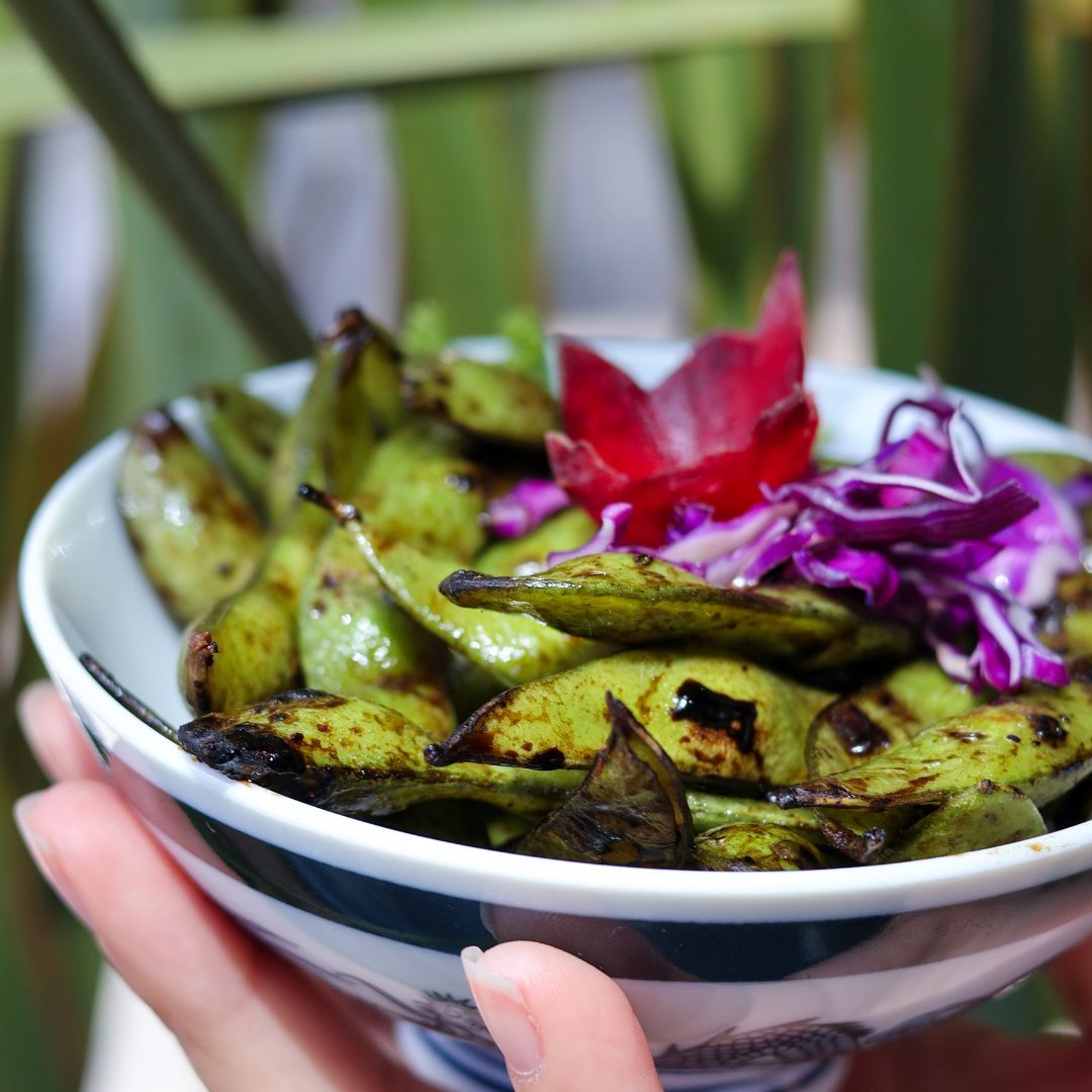 Vainas de frijol de soya asadas a la plancha con salsa de soya,de sabor más intenso y textura ligeramente tostada.