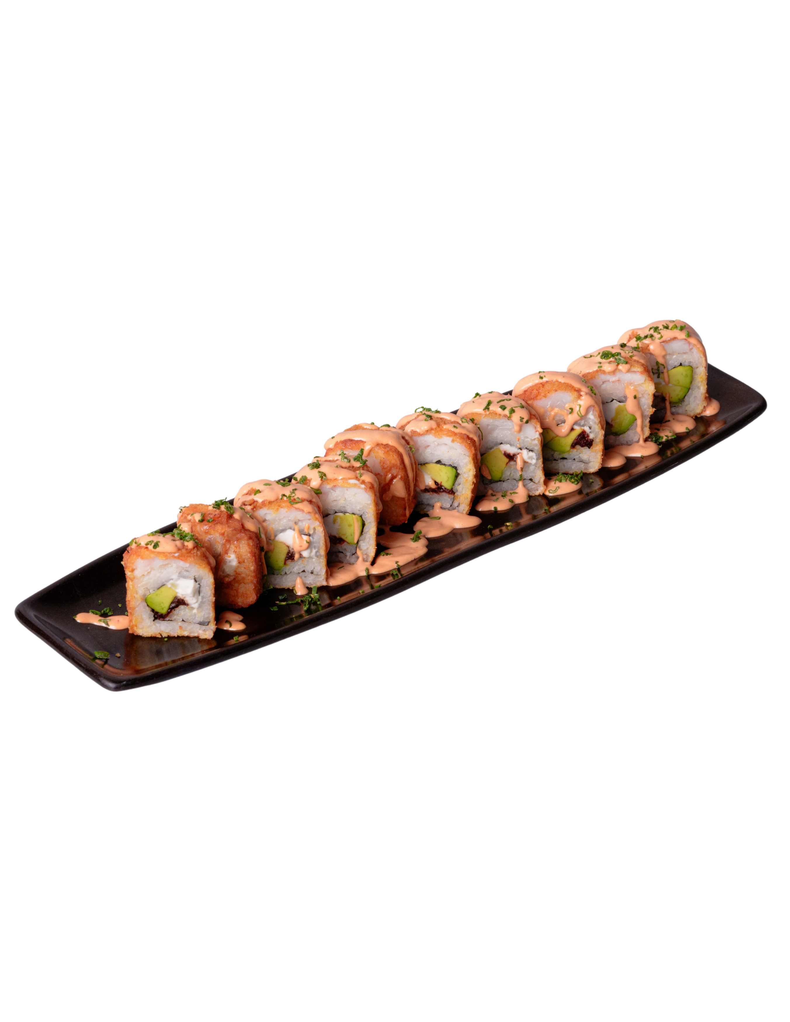 Relleno de aguacate, pepino y surimi (25 g), cubierto con arroz shari, queso crema (40 g) y con crujiente empanizado. Coronado con aderezo tampico (80 g) y salsa sriracha.