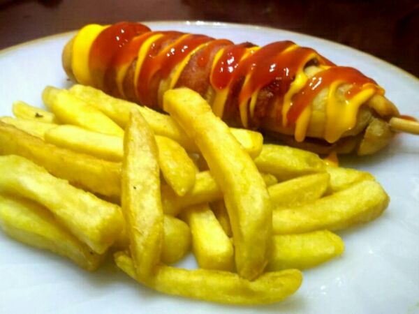 Momia con tocino+ papas a la francesa (cátsup y queso).