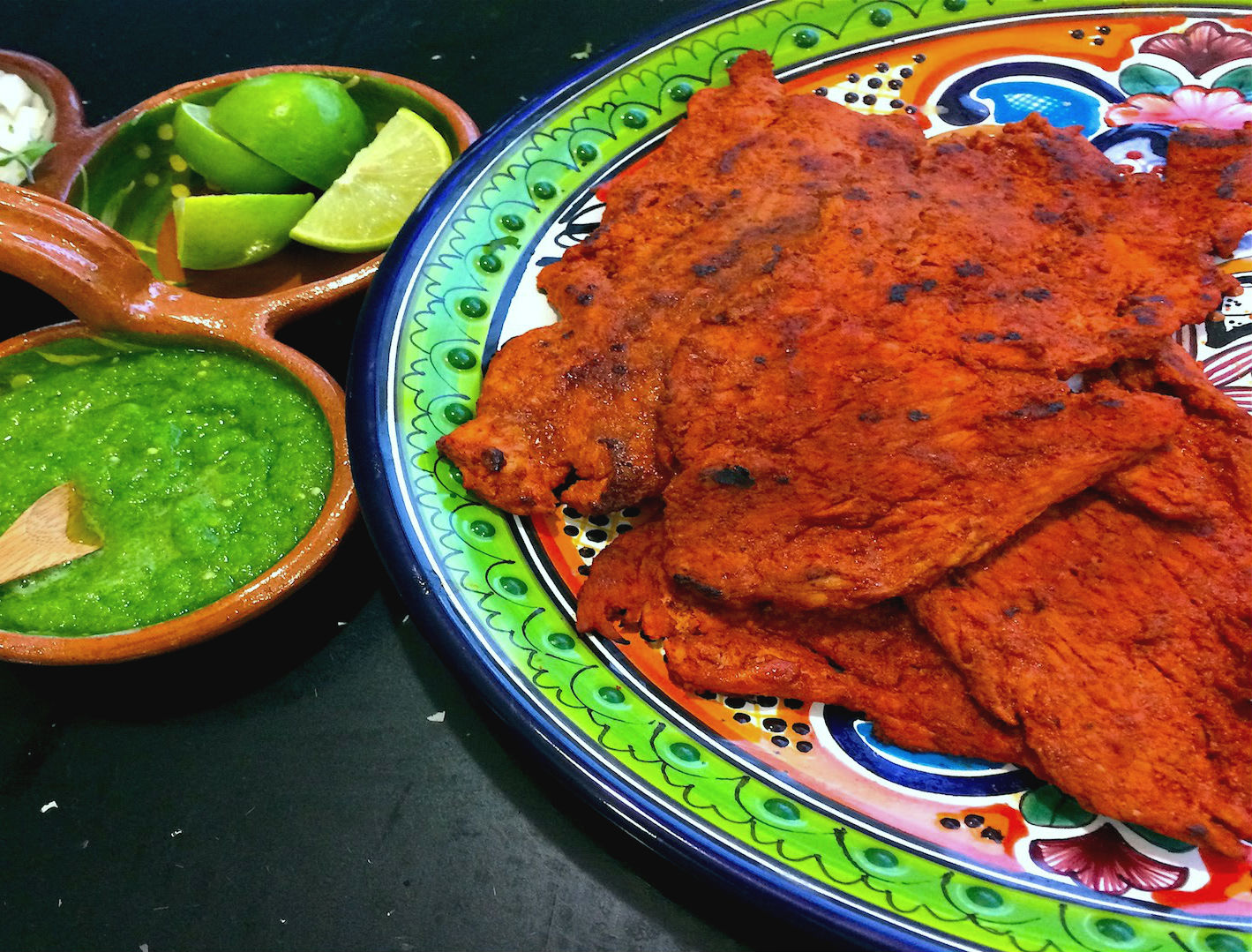 Carne de cerdo enchilada acompañada de 2 guarniciones a elegir.