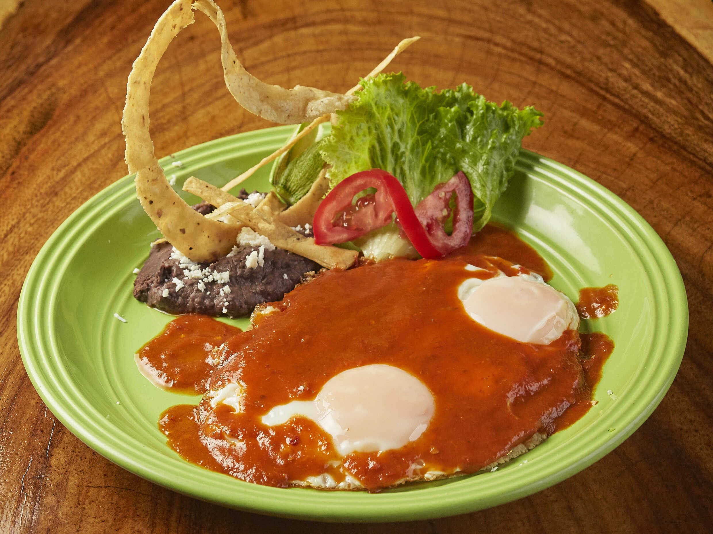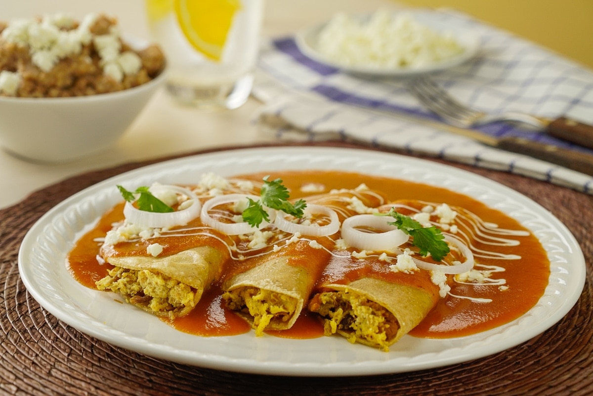 Enchiladas rellenas de huevo revuelto, con crema, queso, cebolla, aguacate, frijolitos y totopos.