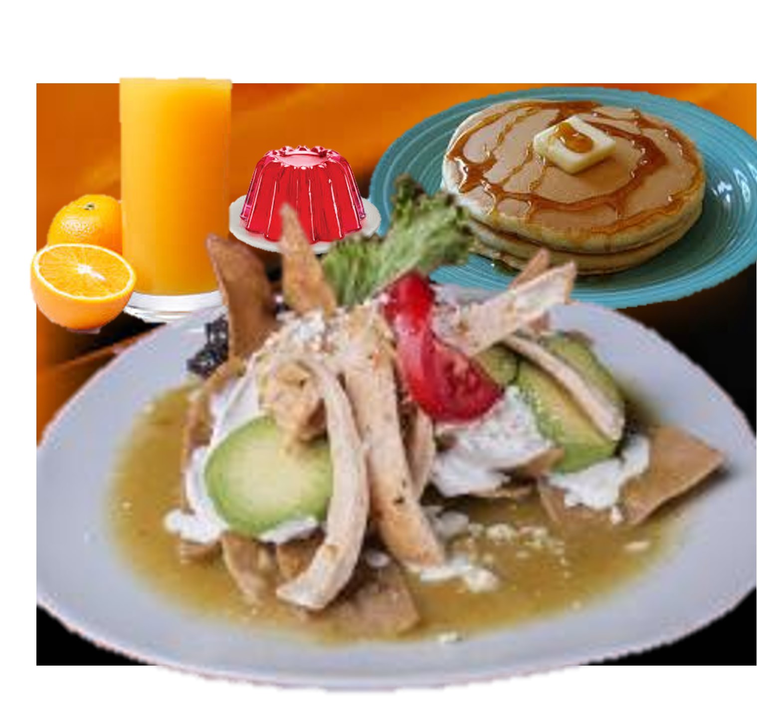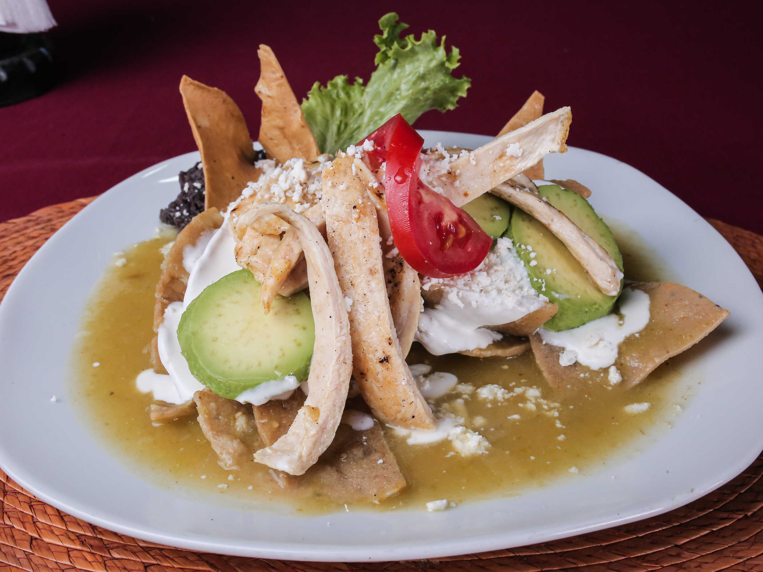 Deliciosos Chilaquiles (Verdes o rojos) servidos con pollo, queso, crema y cebolla . Incluye 3 complementos a elegir.