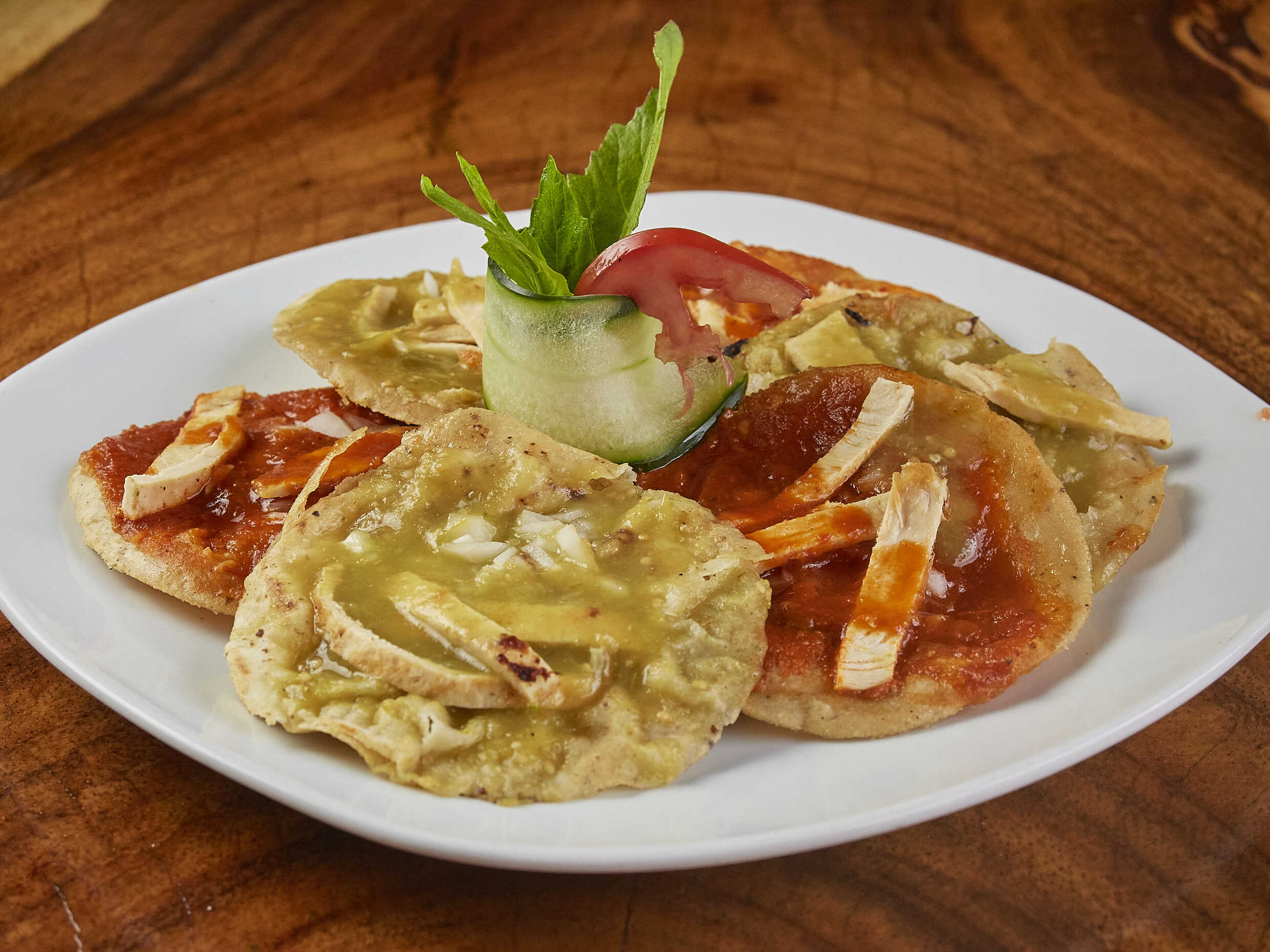 6 piezas de chalupas, tres con salsa roja y tres con salsa verde con pollo y cebolla picada.
