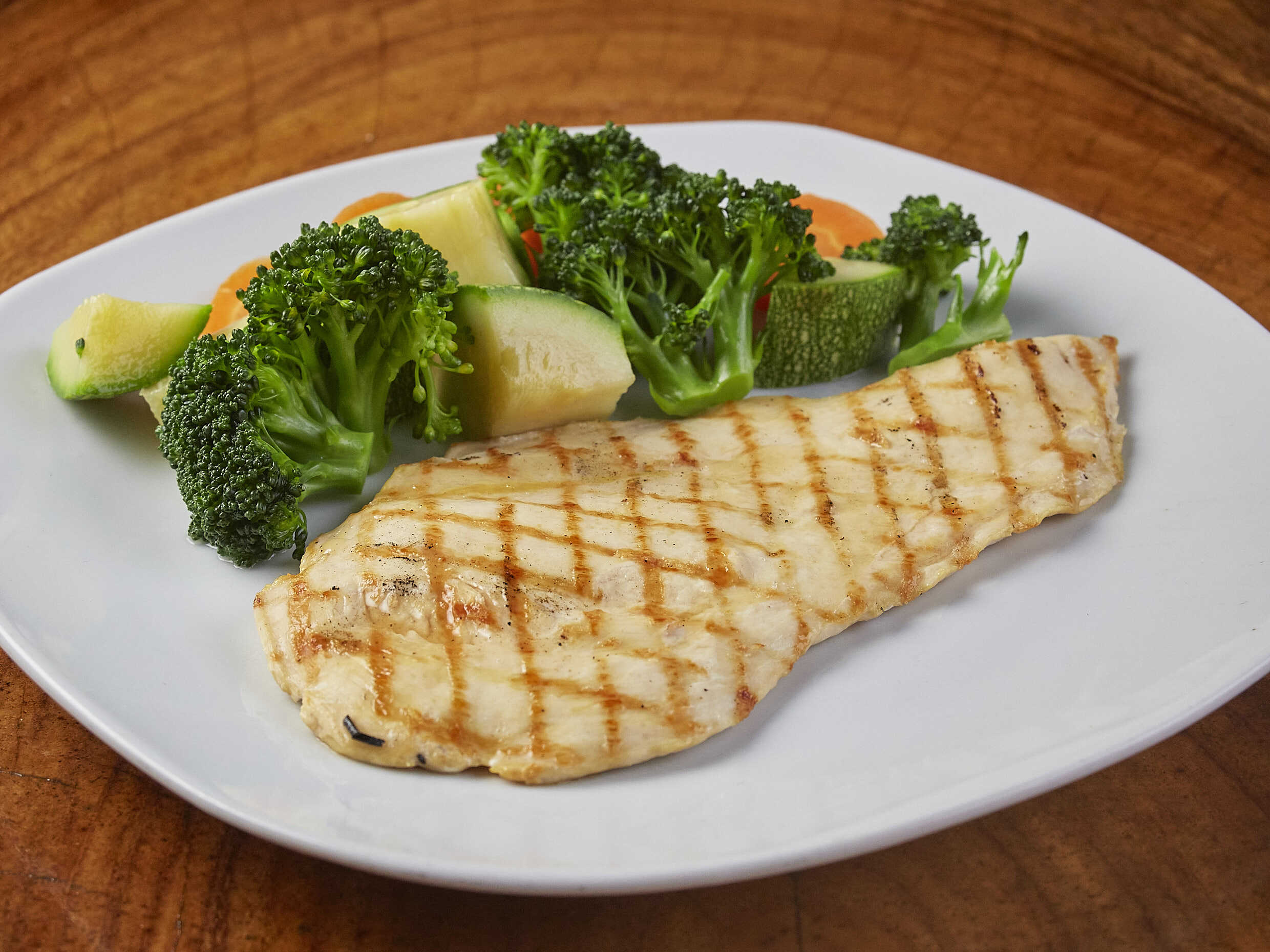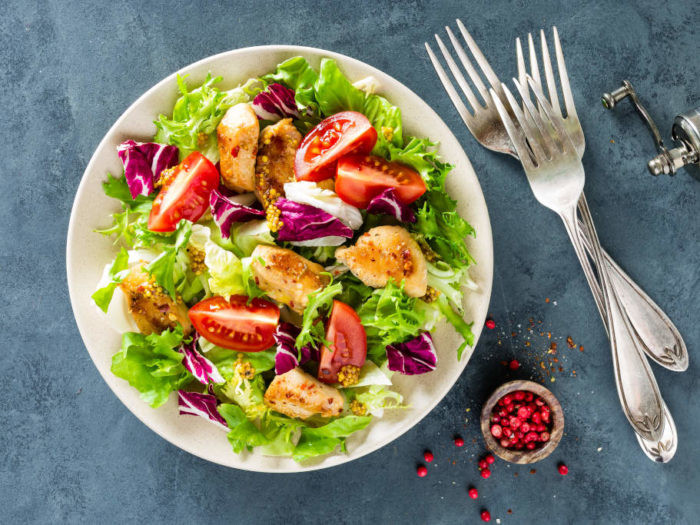 Ensalada mixta de lechugas y vegetales de temporada acompañada de una jugosa pechuga asada.