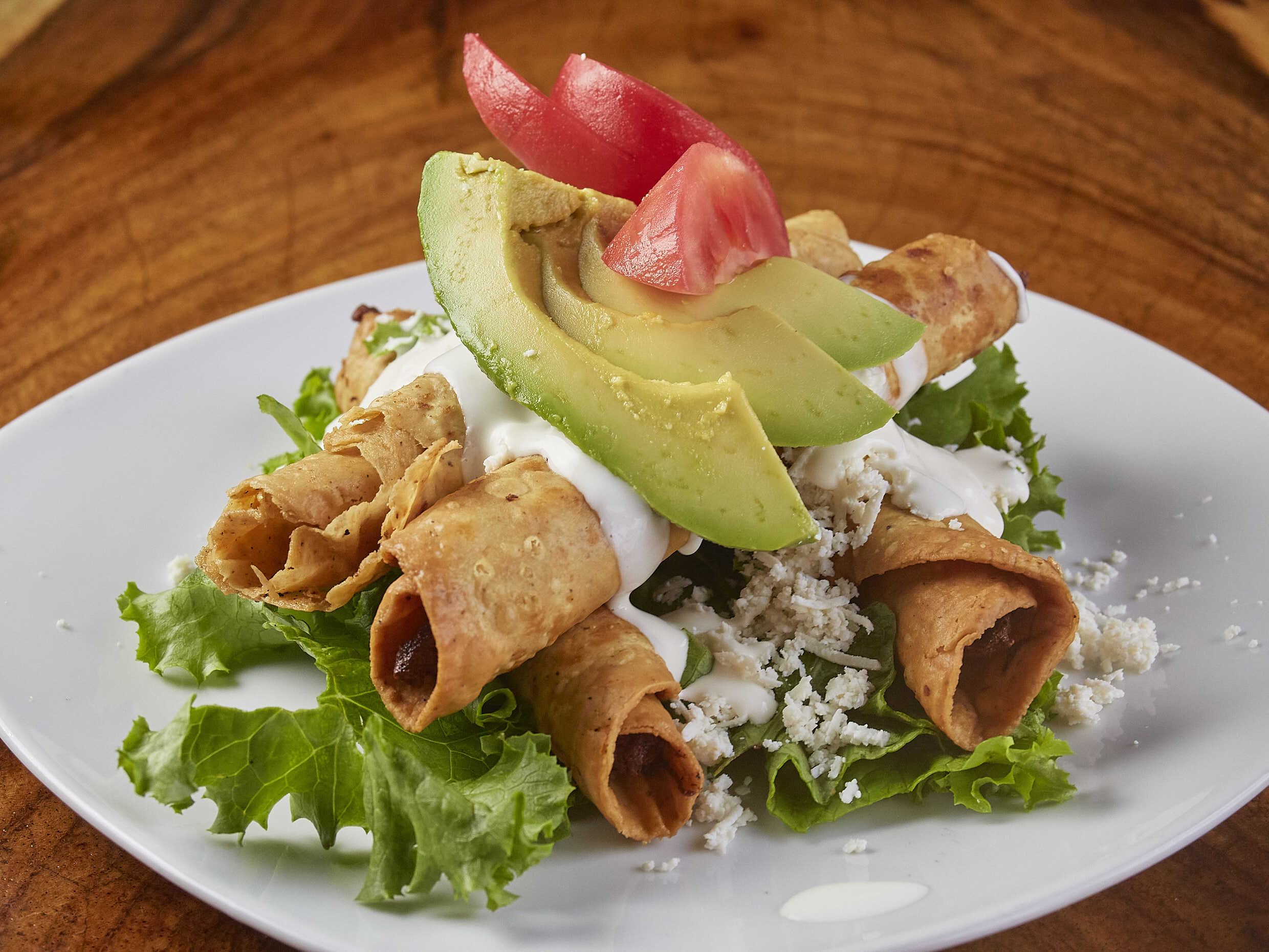 ( 4 piezas de taco), Flautas rellenas de pollo, fritas en aceite acompañados de lechuga, crema, queso, y salsa.