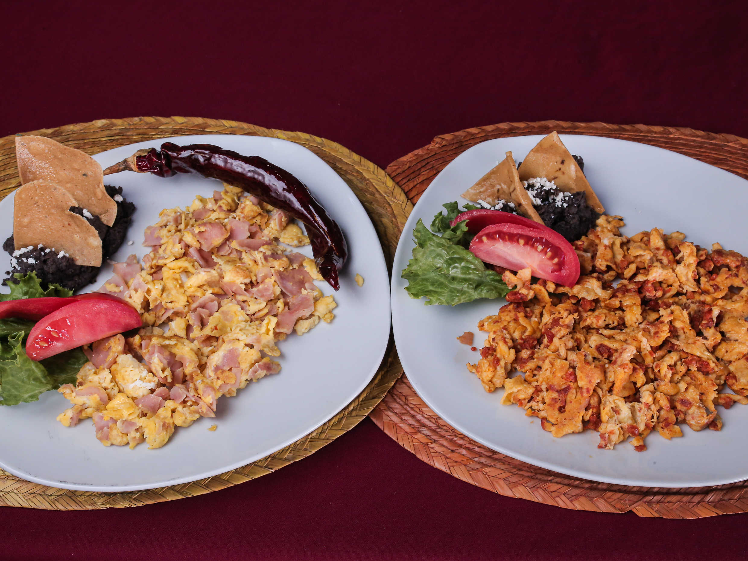 Un par de huevos revueltos con jamón, acompañados de frijolitos y totopos.