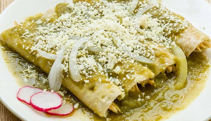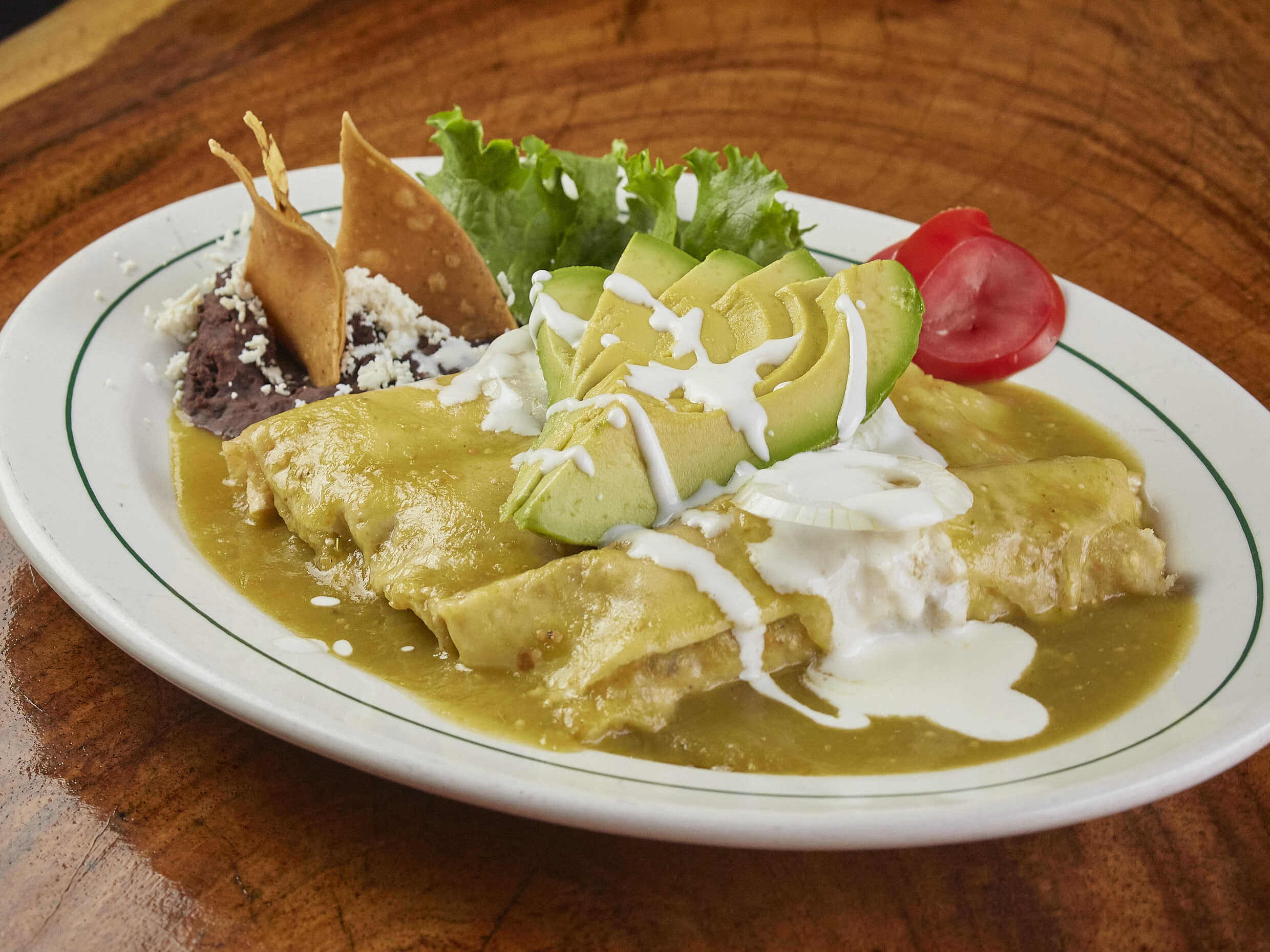 Enchiladas verdes rellenas de pollo con crema, queso, cebolla, aguacate, frijolitos y totopos.
