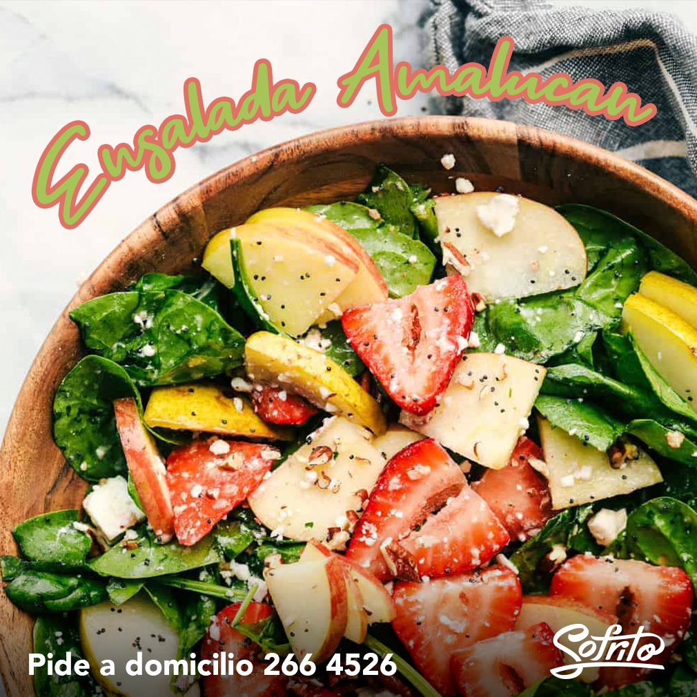Mix de espinacas servida con fresa, queso panela, manzana, cacahuate tostado y vinagreta de manzana caramelizada.