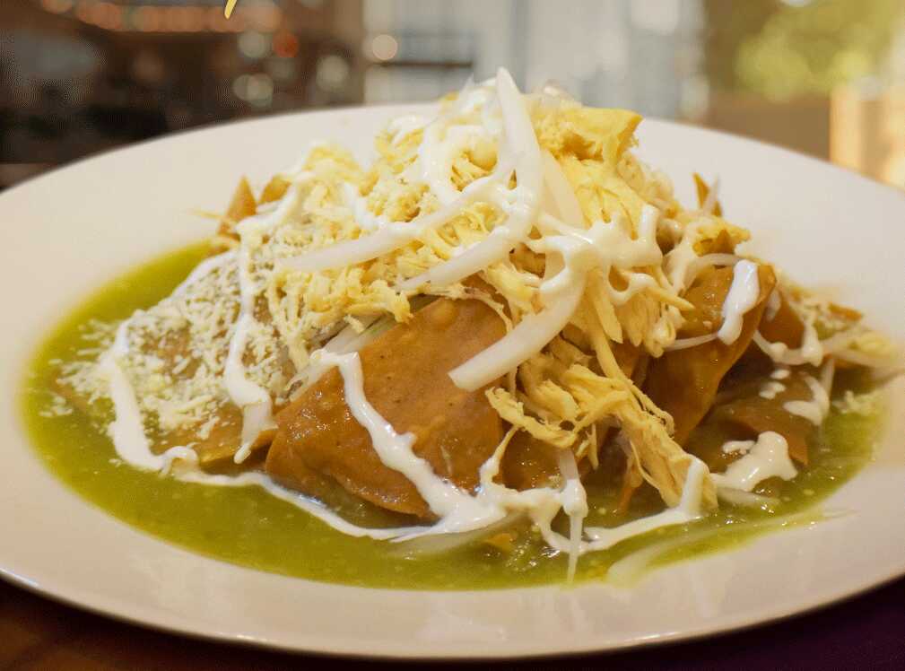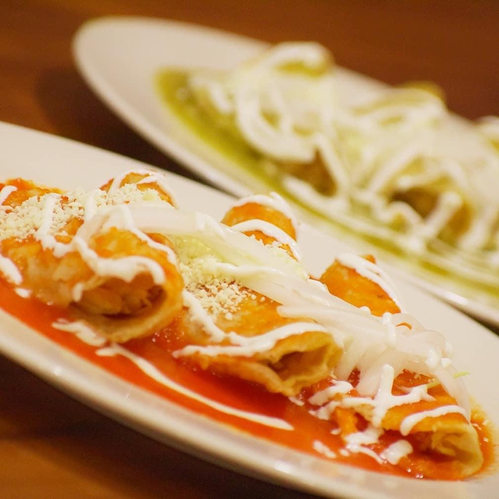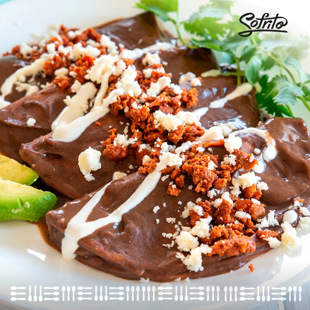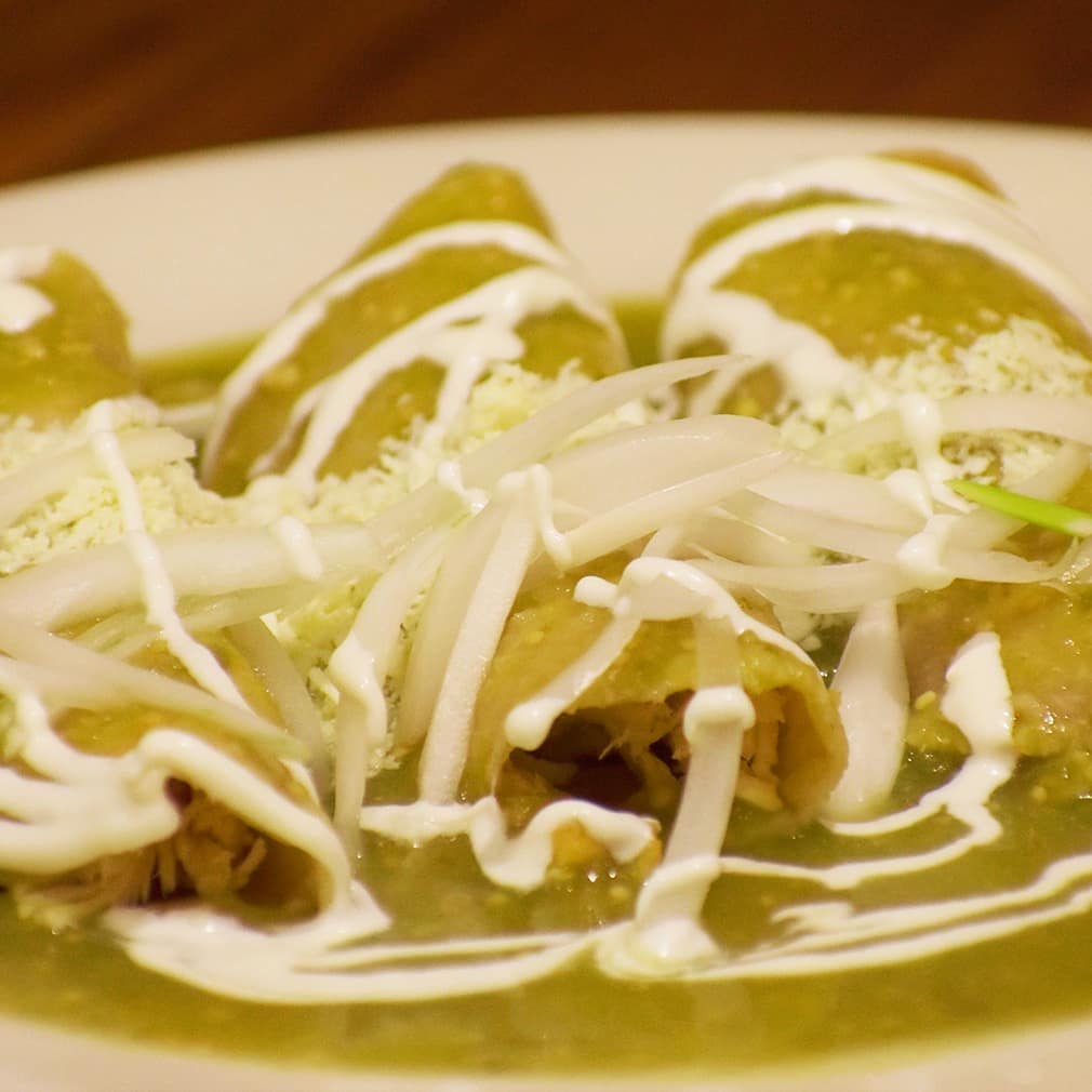 Elaborado con 3 tortillas, pollo, salsa de frijol y rajas poblanas, gratinadas con queso gouda y Oaxaca, acompañados de salsa roja y verde.