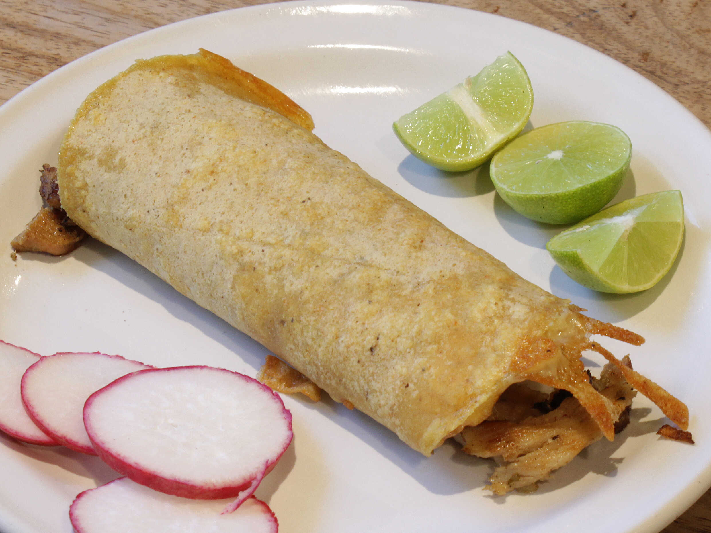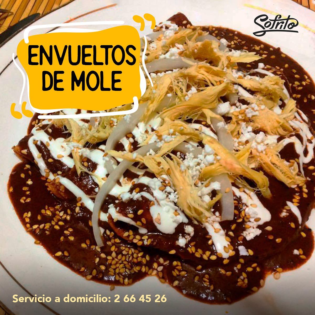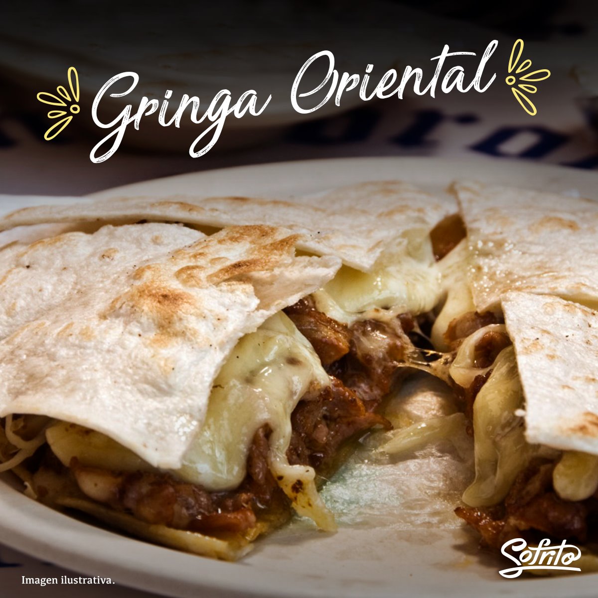 Elaborado con 3 tortillas, pollo, salsa de frijol y rajas poblanas, gratinadas con queso gouda y Oaxaca, acompañados de salsa roja y verde.