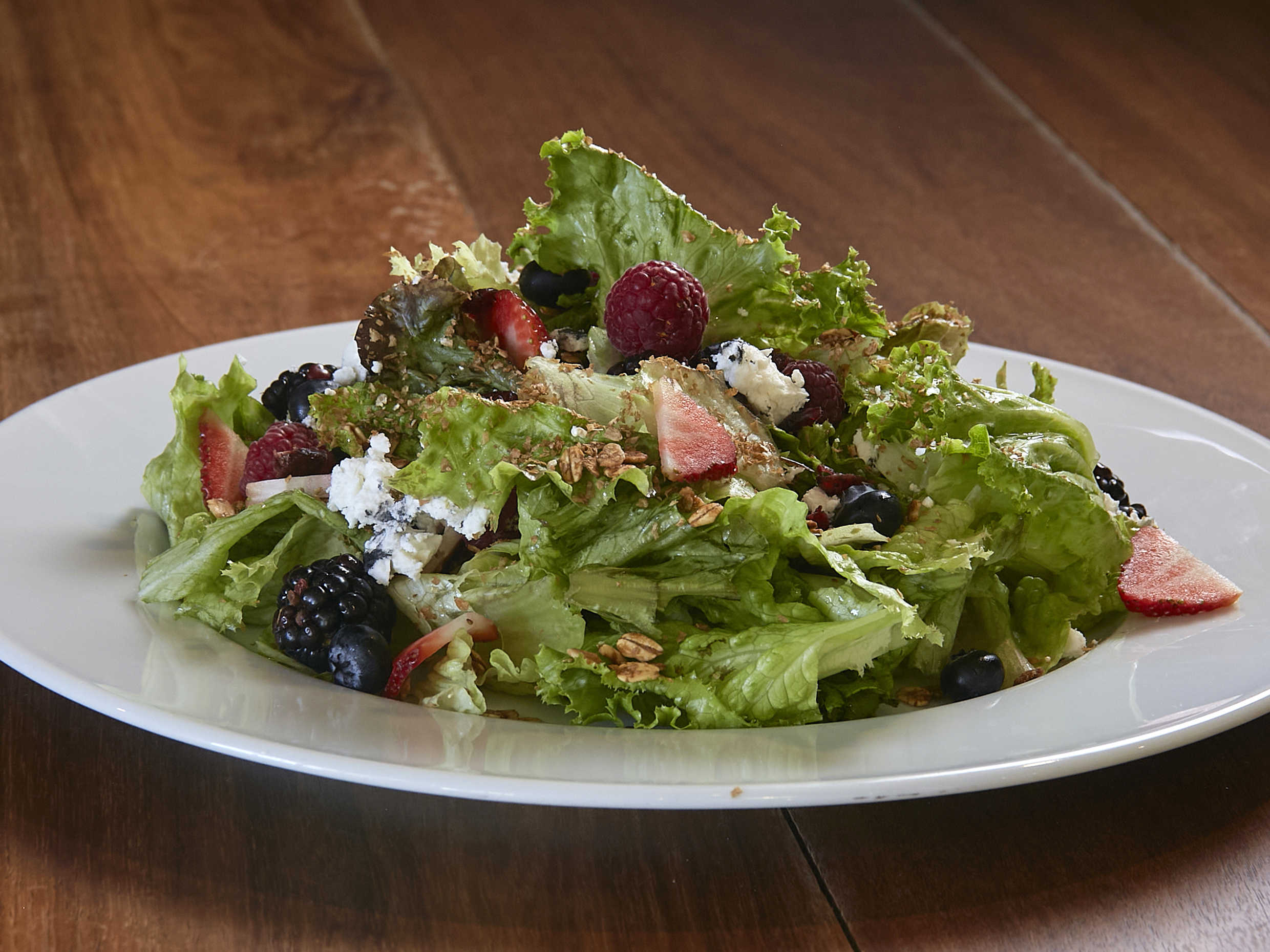 Mix de lechugas acompañado de fresa, zarzamora, arándano, nuez y queso de cabra, granola, terminada con vinagreta de balsámico.