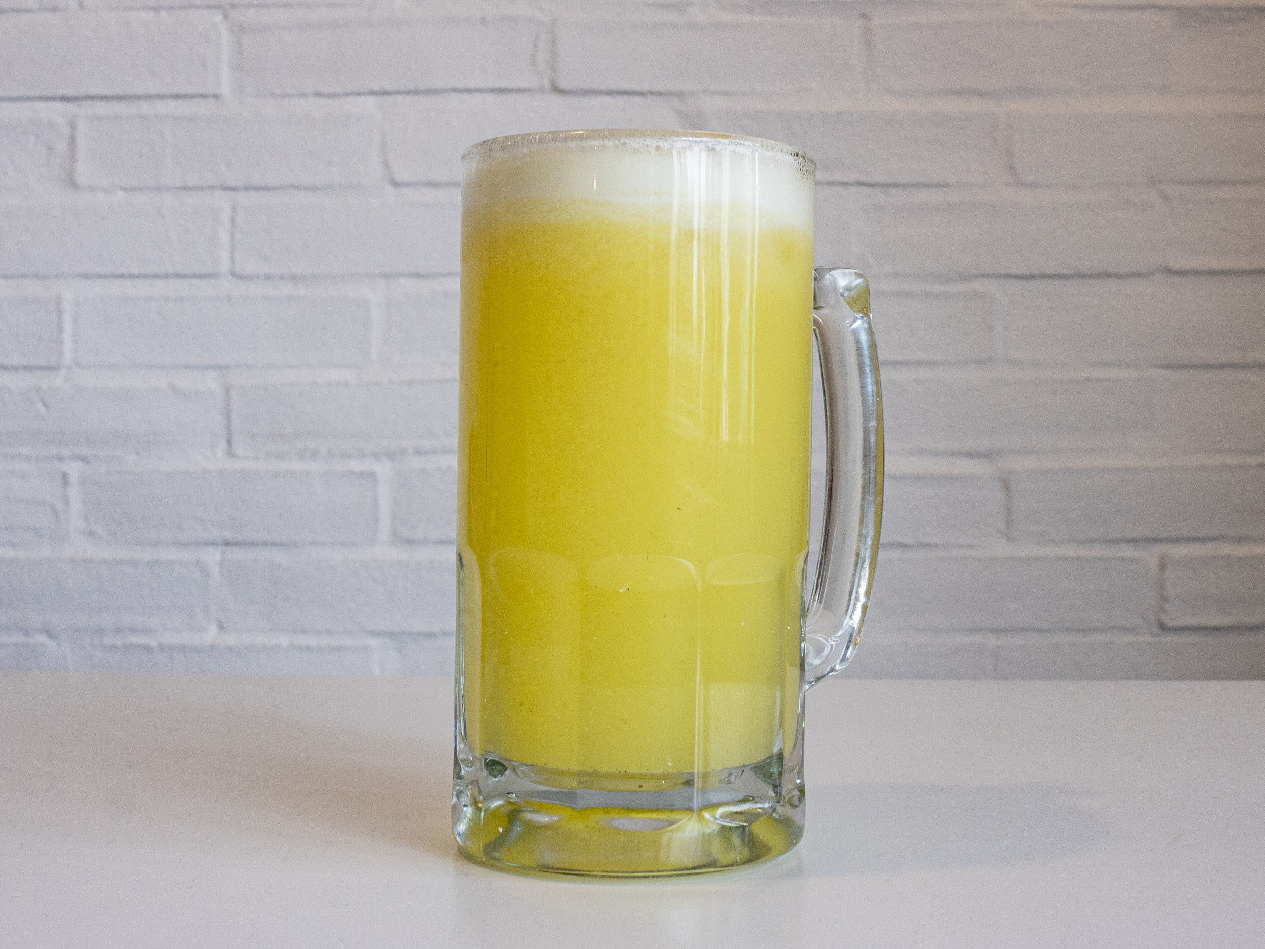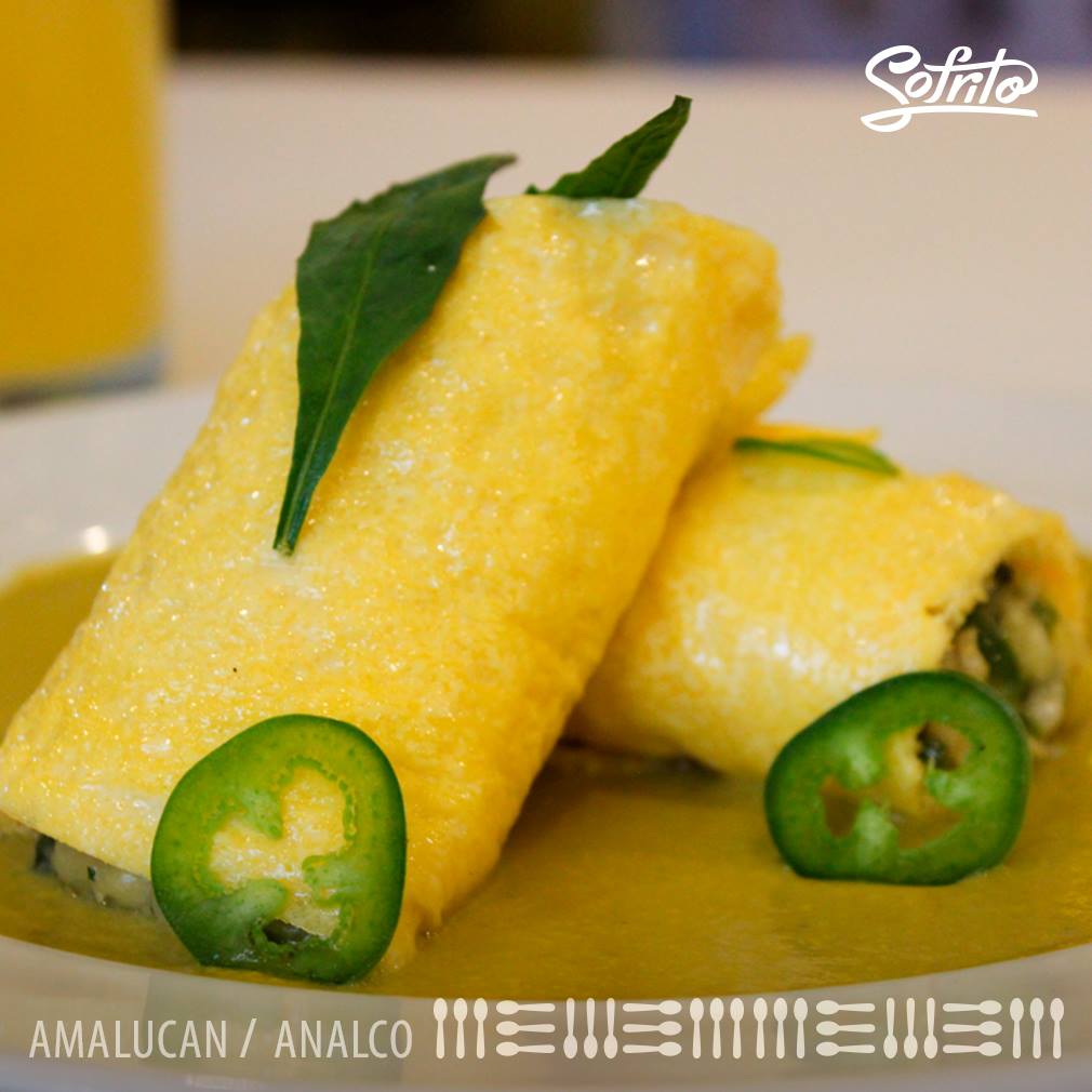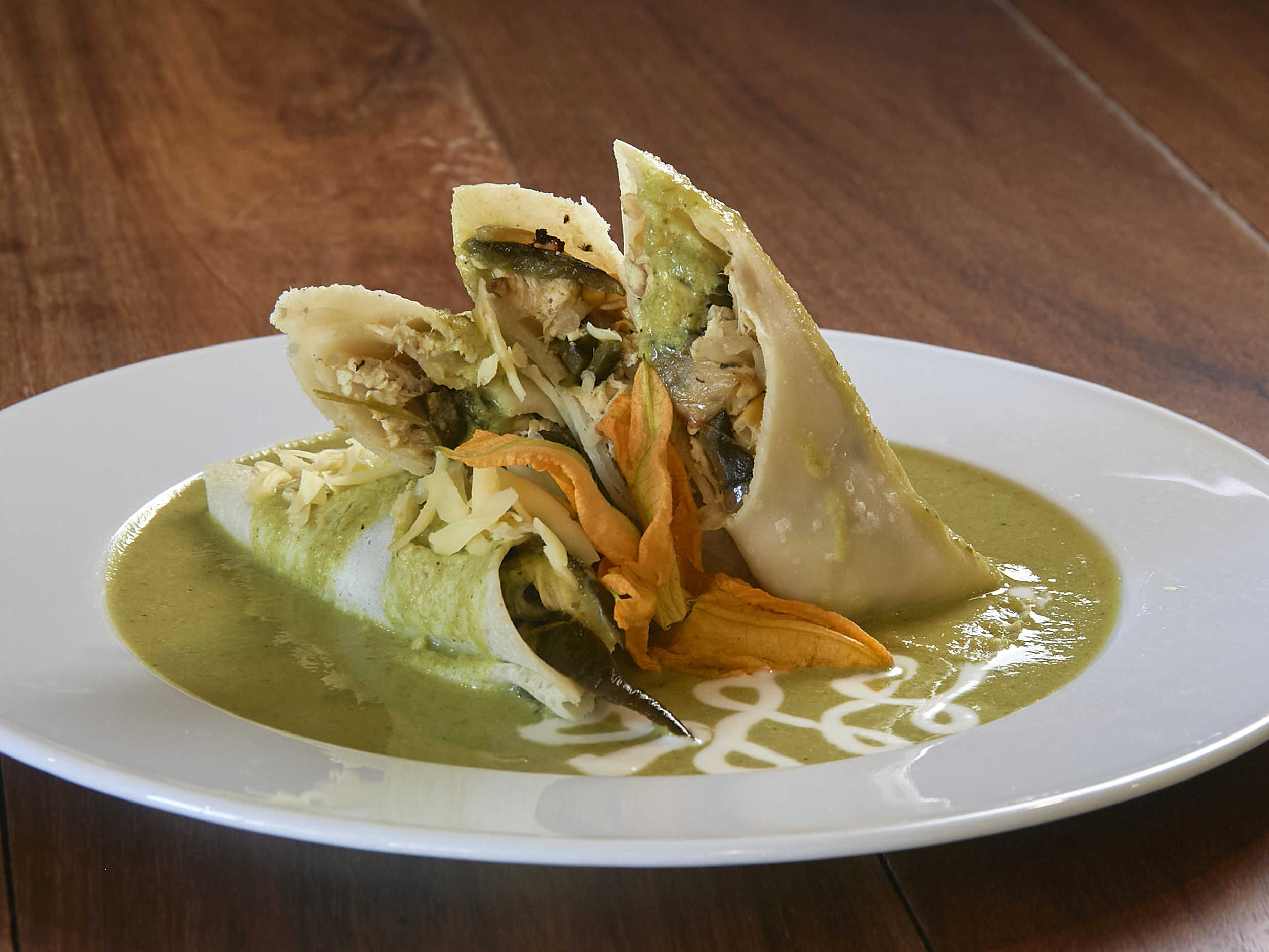 Relleno de granos de elote natural, cebolla, epazote, rajas de jalapeño y queso gouda. Servido sobre un terso espejo de salsa de flor de calabaza.