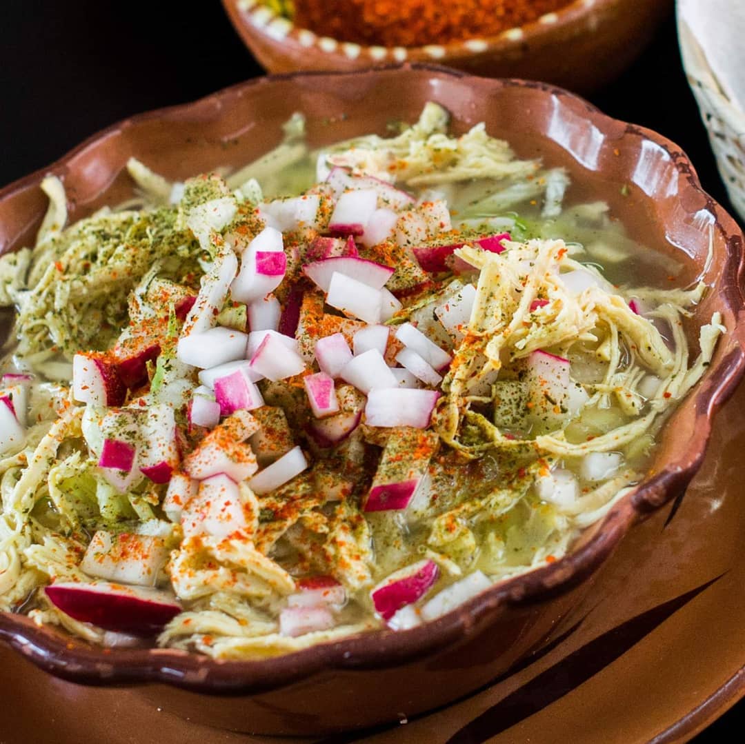 Servida con aguacate, cebolla, quesillo, rajas de chile en vinagre o chipotle y pápalo.