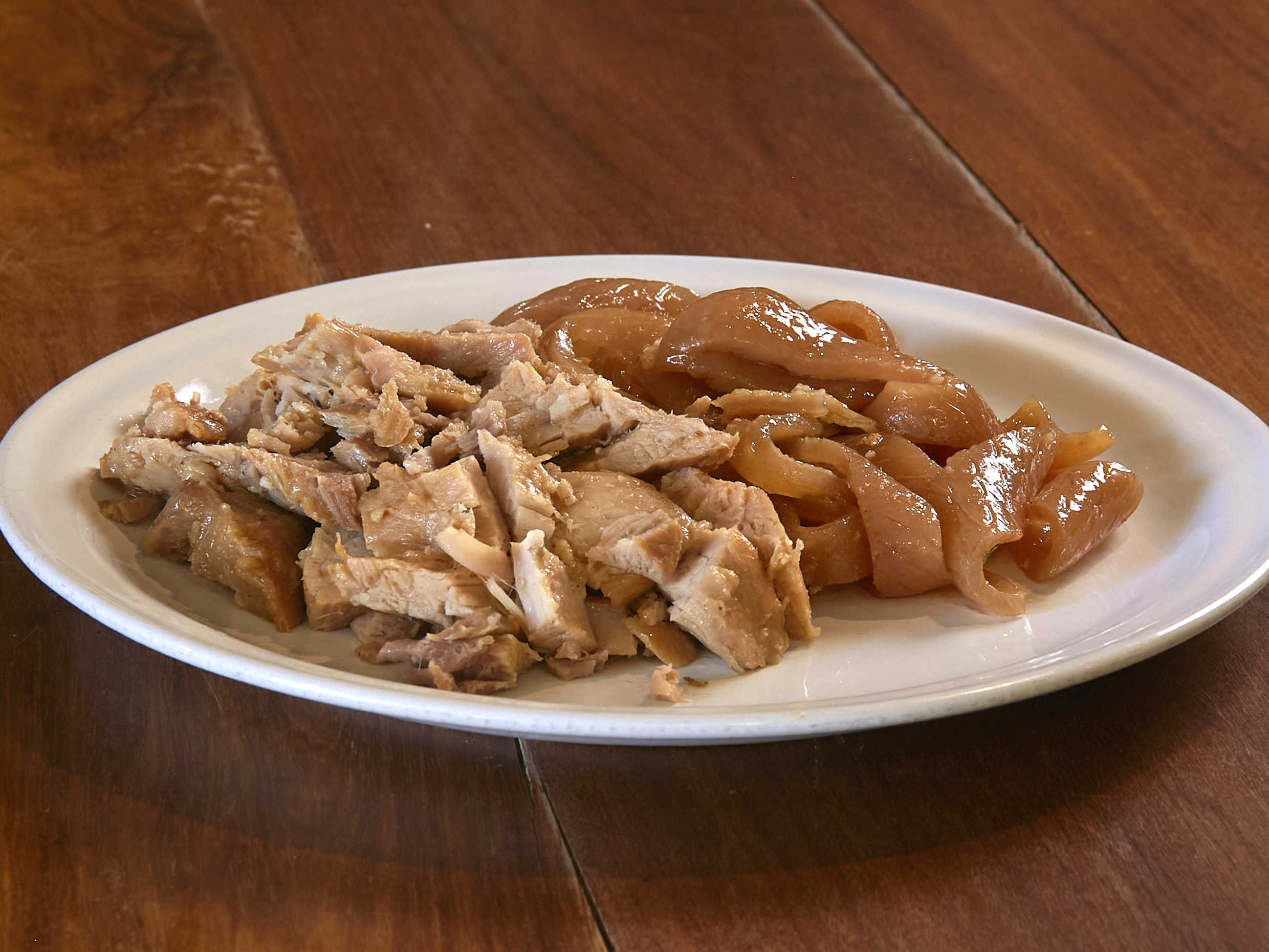 Tres piezas acompañadas con pollo, cebolla morada y ajonjolí.