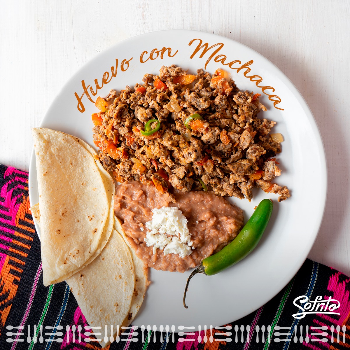 (180grs) Huevos revueltos a la mexicana acompañados de machaca norteña, bañados con salsa roja y servidos con tortillas de harina.