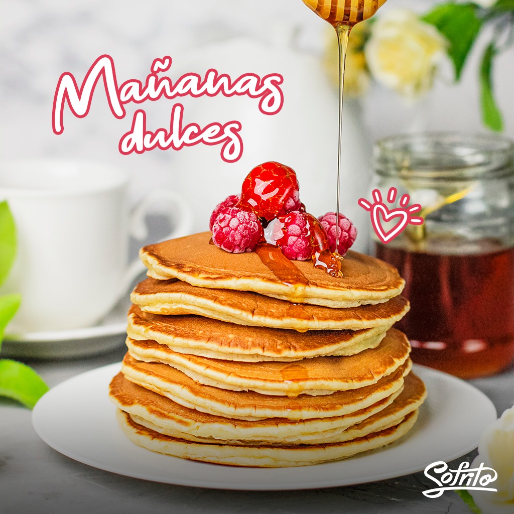 Tres piezas de hot-cakes servidos con fruta, acompañados con miel maple, mantequilla y mermelada. Además, hay opción a complementar con el ingrediente de su elección.