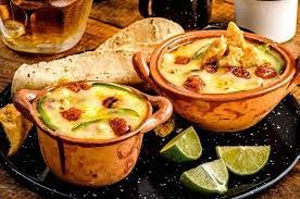 Tradicional queso derretido en cazuela de barro servido con carne árabe y chorizo.