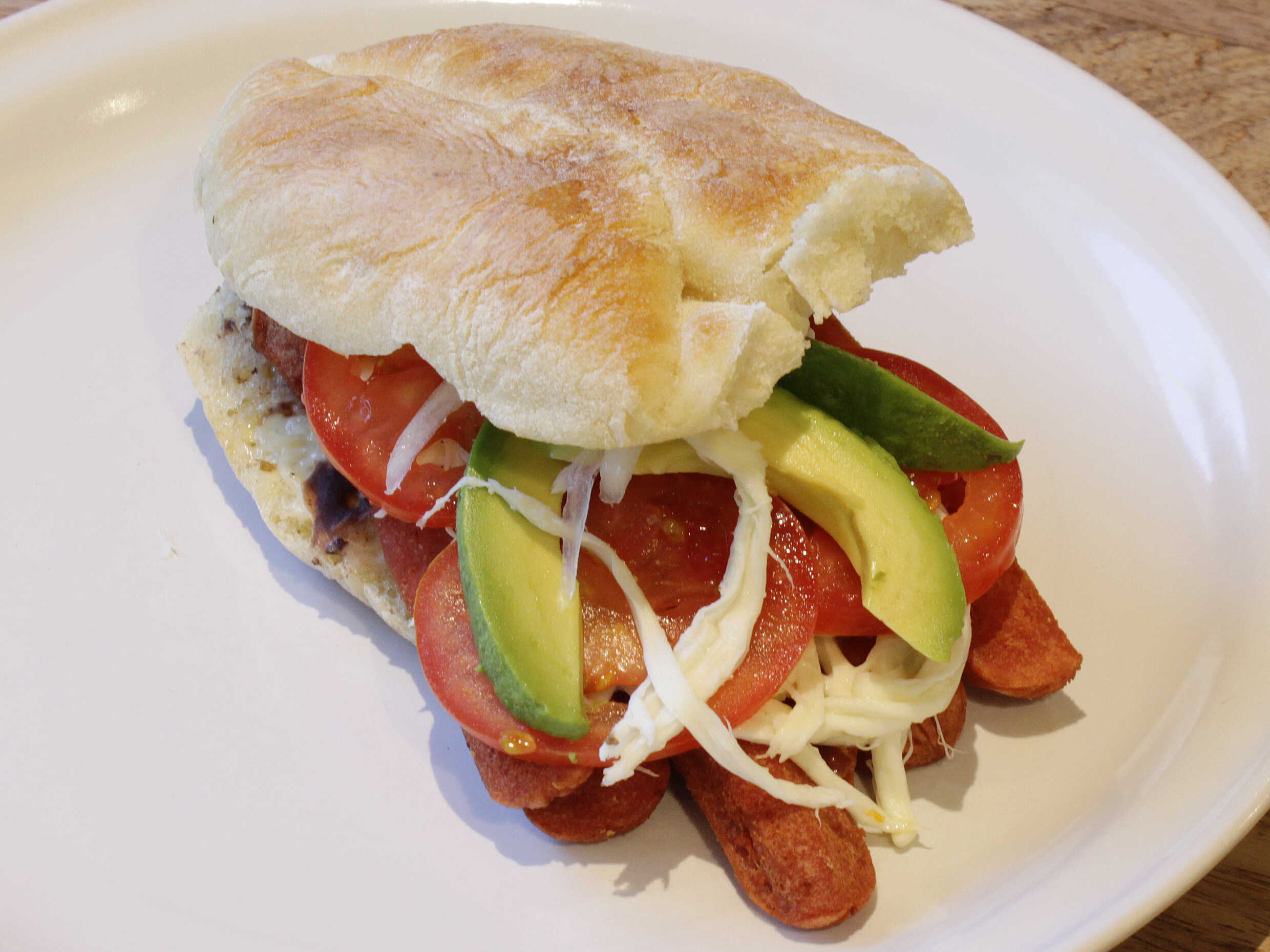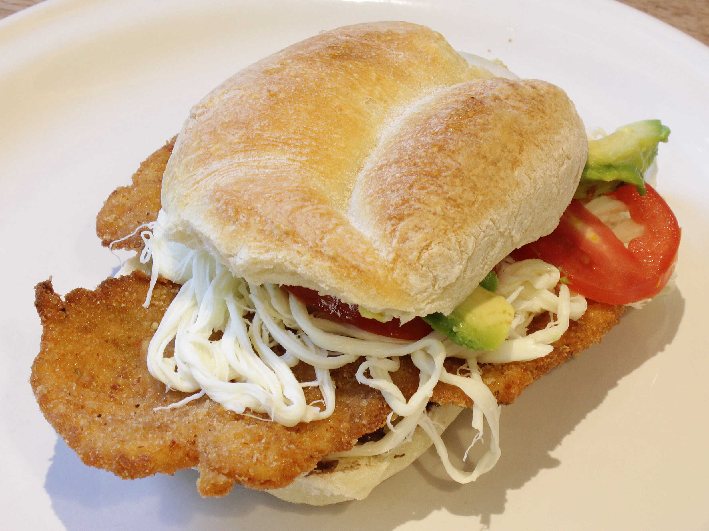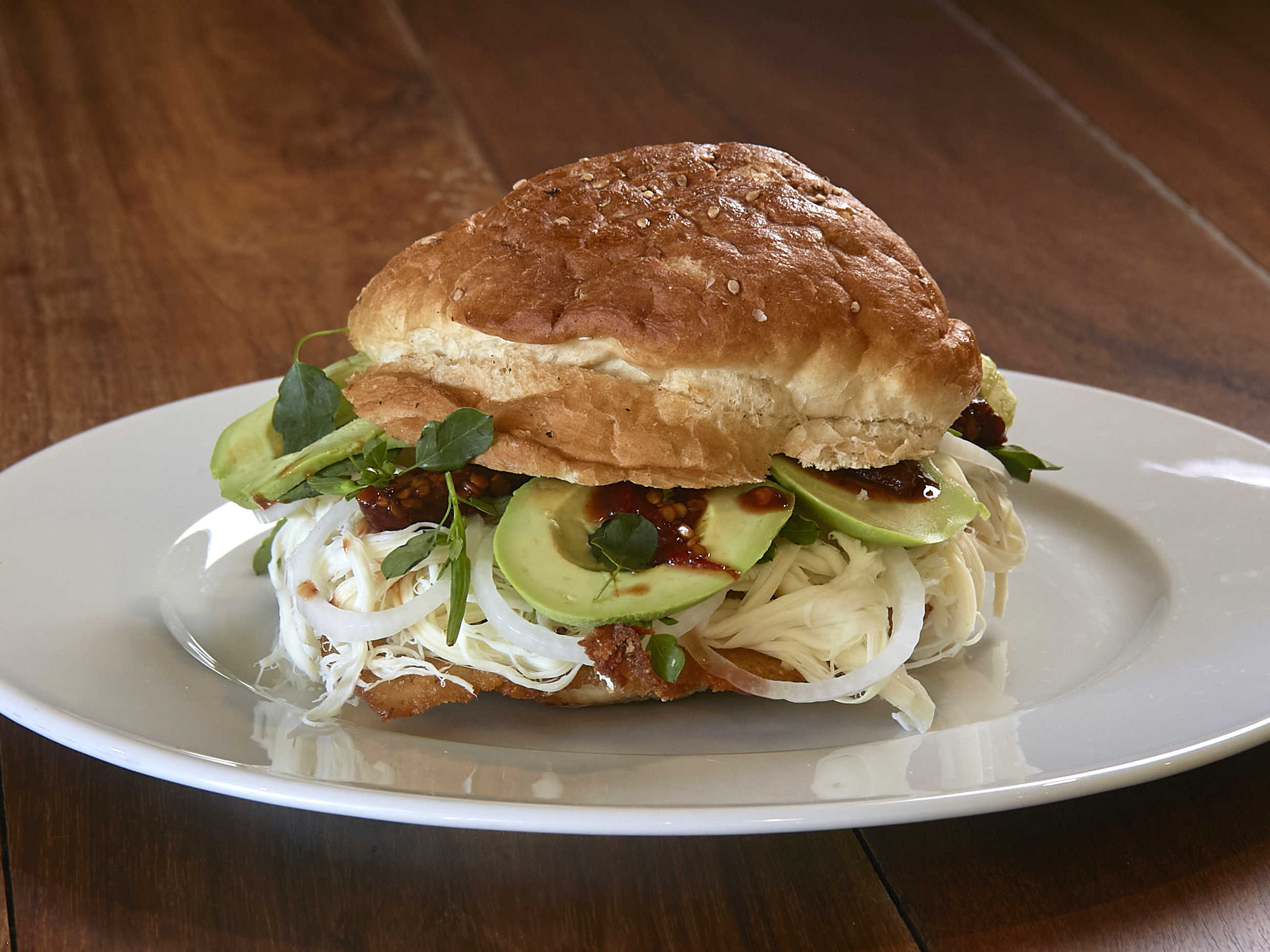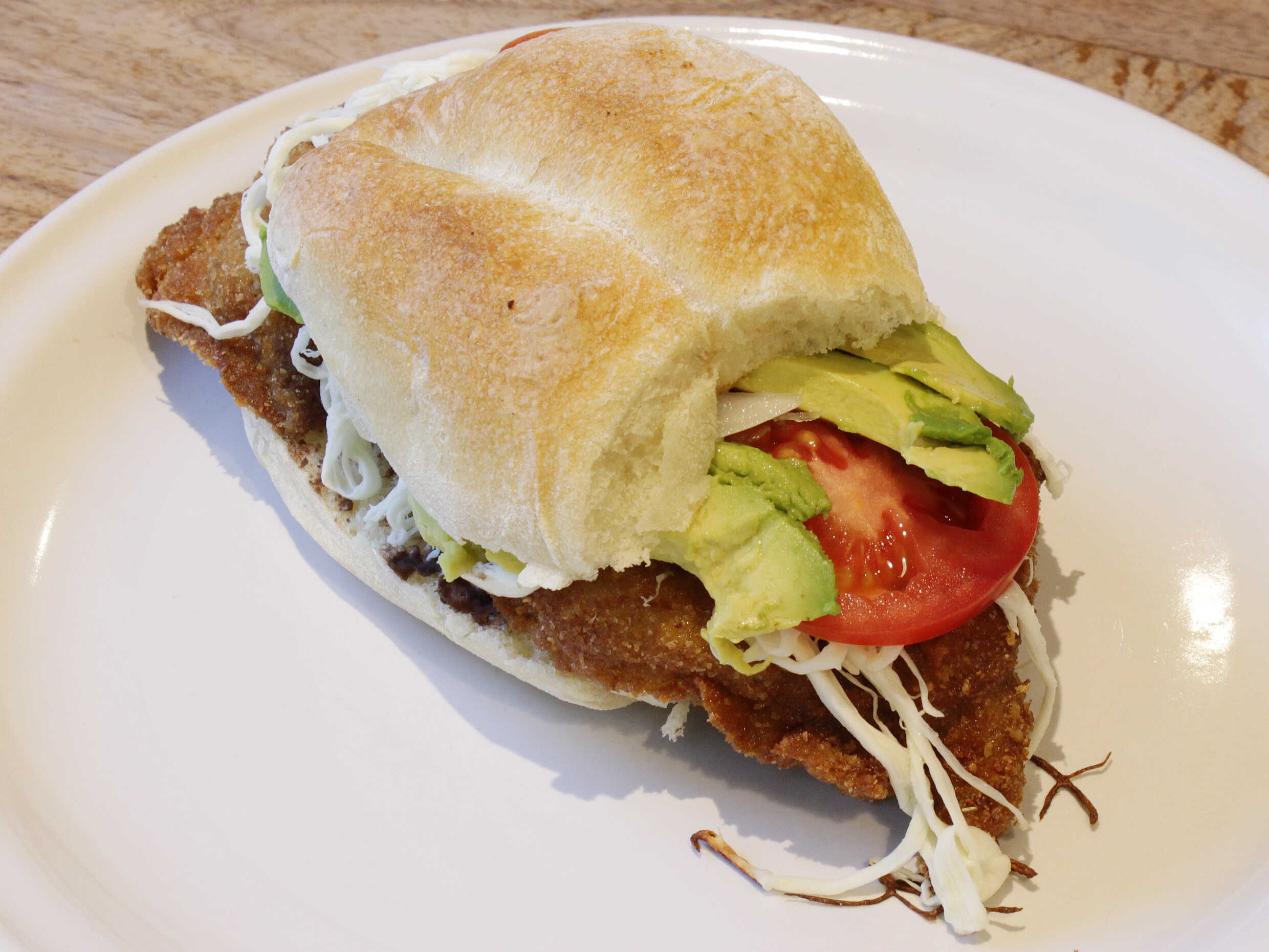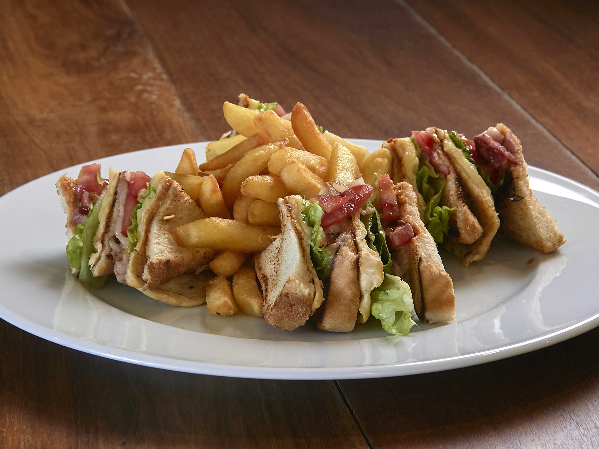 Tradicional sándwich servido con pechuga de pollo asada, jitomate, mayonesa de chipotle, lechuga, tocino, queso manchego y acompañado de papas a la francesa.