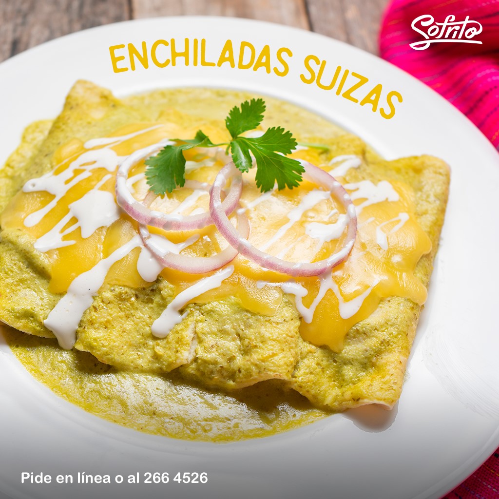 Enchiladas Suizas ( porcion personal ) contiene 3 Tortillas de maiz rellenas de pollo deshebrado 120 gramos aprox, bañadas en salsa de jitomate, gratinadas con queso manchego terminadas con un toque de crema, aguacate.