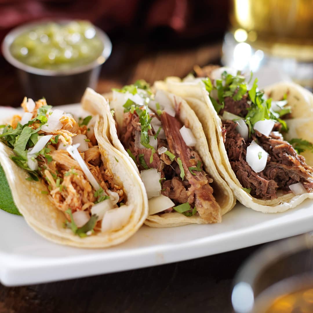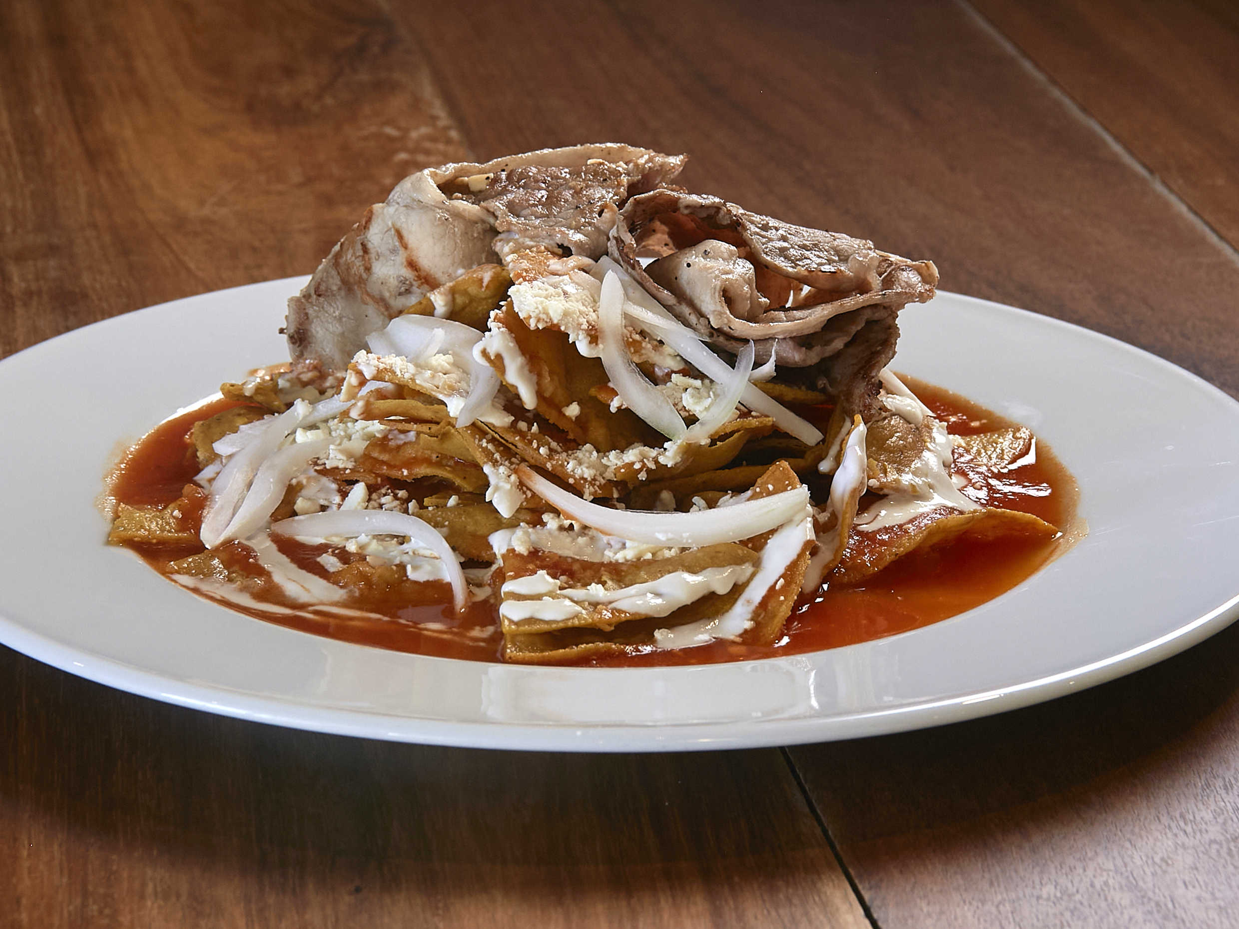 Servidas con jugosa carne de res, bañadas con salsa verde y salsa de chipotle, terminadas con cebolla encurtida, crema, queso y cilantro recio.