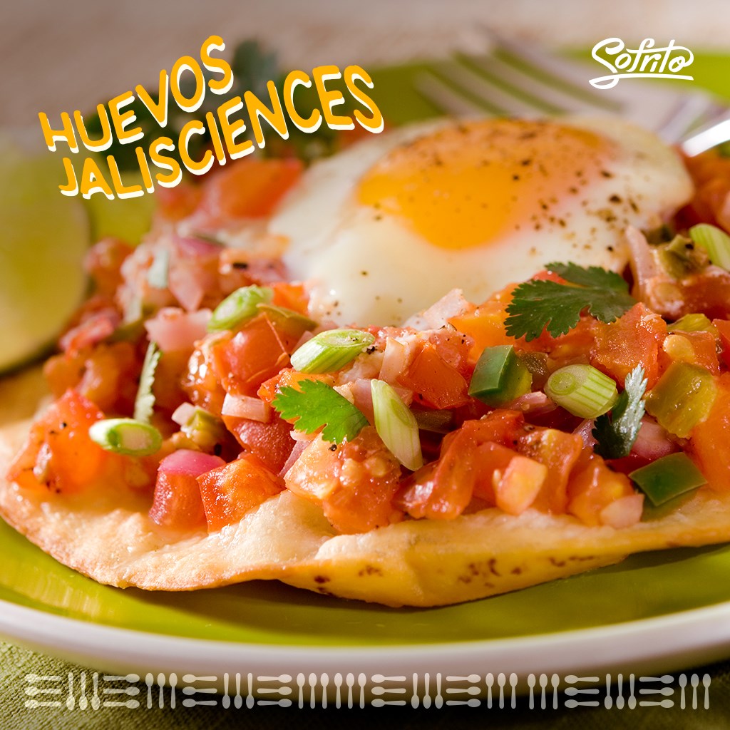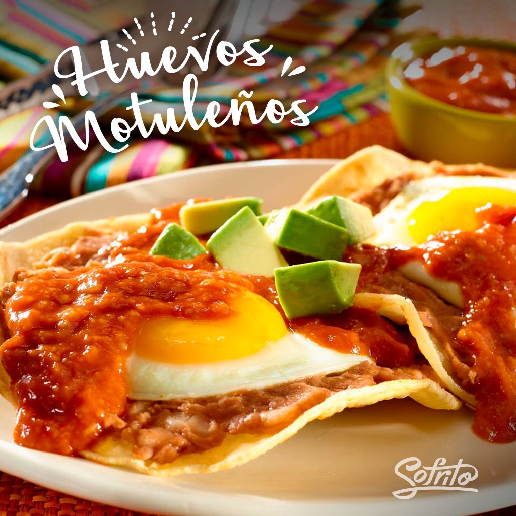 Dos piezas de huevo estrellado, servido sobre tortilla de maíz, bañados con salsa martajada y acompañados con frijoles refritos, chicharos y láminas de plátano macho.