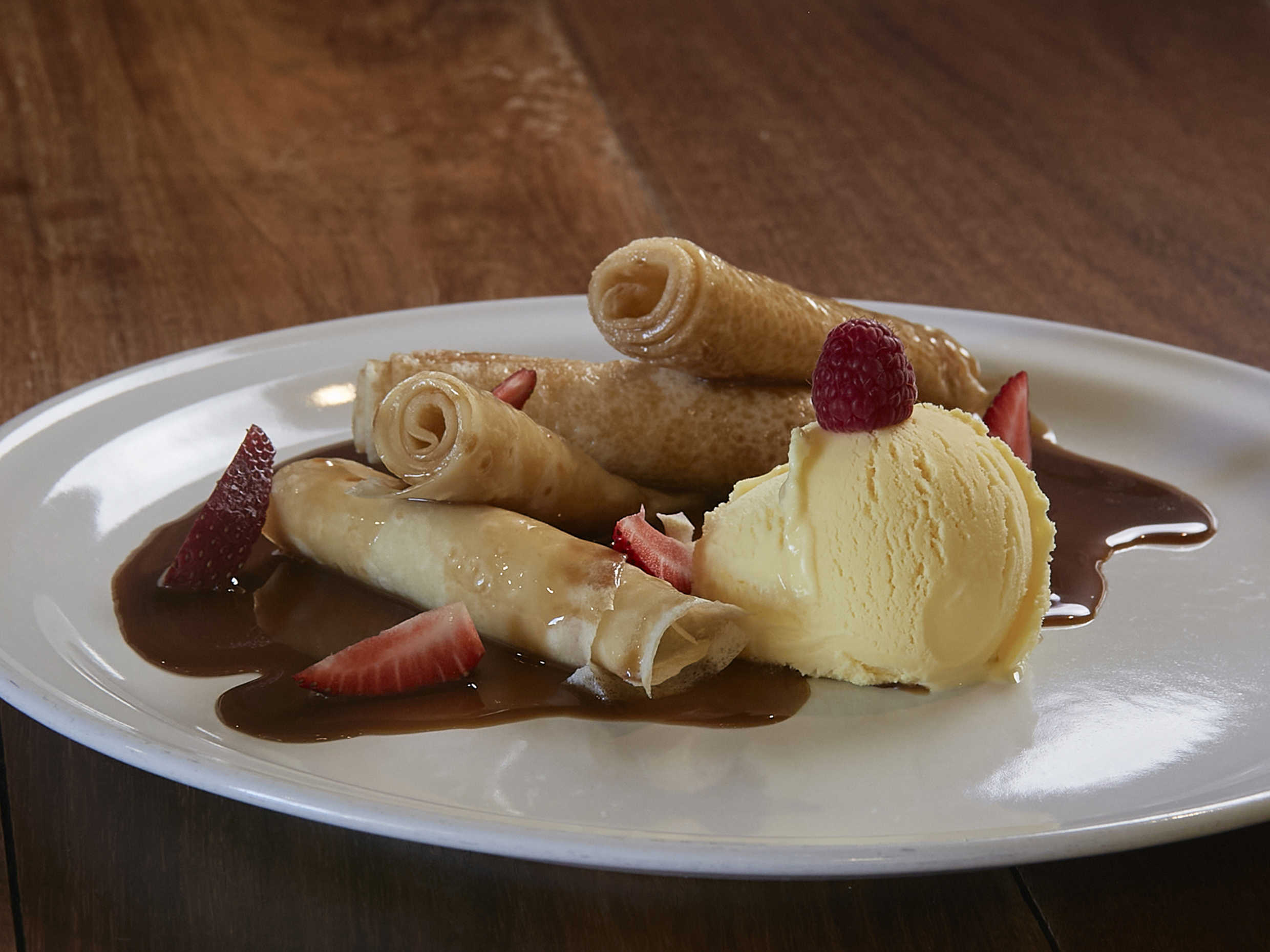 Trilogía de crepas servidas con salsa de cajeta, helado de vainilla, nuez y un toque tropical especial de queso crema y limón.