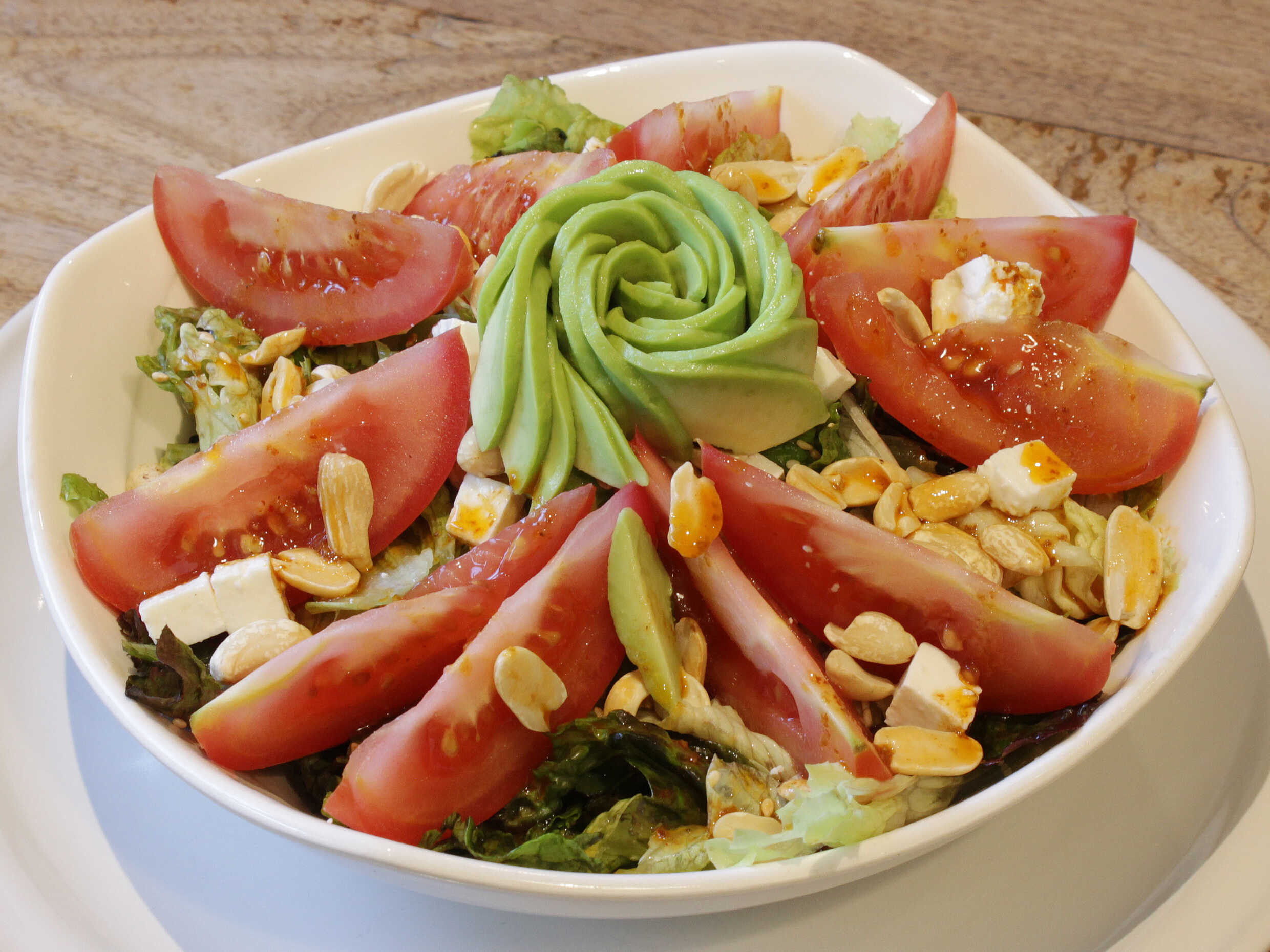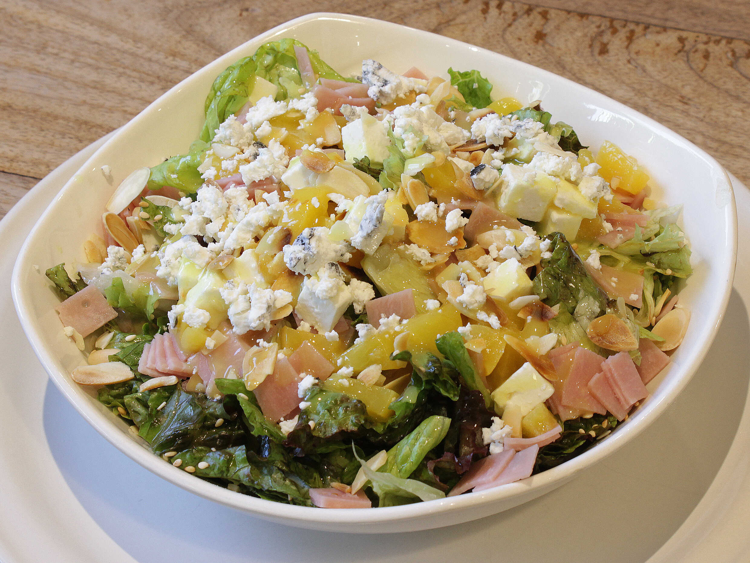 Fresco mix de lechugas servida con jamón, queso panela, duraznos en almibar, queso de cabra, ajonjolí y almendras fileteadas, terminada con un aderezo de miel mostaza.
