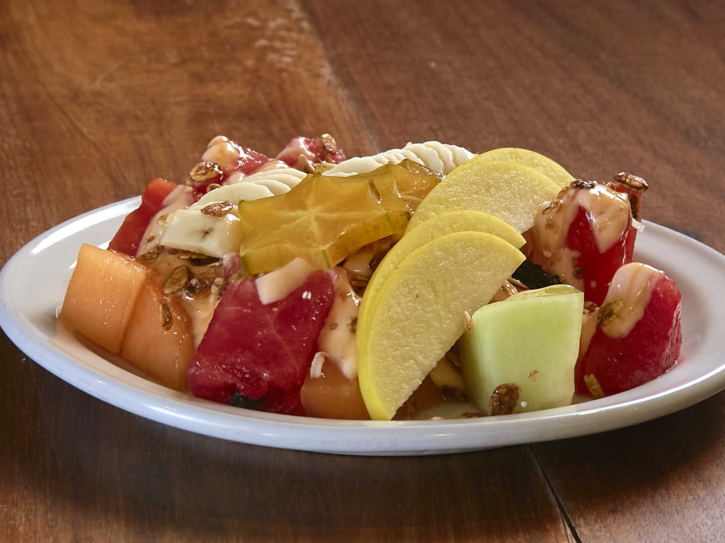 Fresco mix de lechugas acompañado de kiwi,piña,manzana,nuez caramelizada,coco rallado,queso cottage, arándanos y vinagreta de naranja.